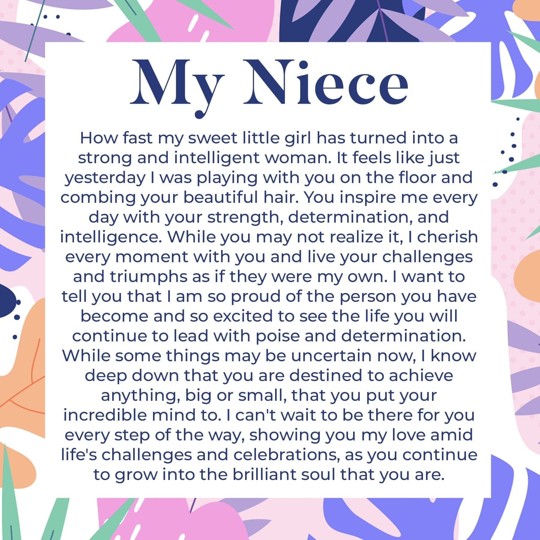 Niece Quote: How fast my sweet little girl has turned into a strong and intelligent woman. It feels like just yesterday I was playing with you on the floor and combing your beautiful hair. You inspire me every day with your strength, determination, and intelligence. While you may not realize it, I cherish every moment with you and live your challenges and triumphs as if they were my own. I want to tell you that I am so proud of the person you have become and so excited to see the life you will continue to lead with poise and determination. While some things may be uncertain now, I know deep down that you are destined to achieve anything, big or small, that you put your incredible mind to. I can't wait to be there for you every step of the way, showing you my love amid life's challenges and celebrations, as you continue to grow into the brilliant soul that you are. Thank you for visiting and shopping with RaeJais, where you can find just about anything your heart or toolbox desires. From gold and diamonds to plumber tools and pool noodles, we’ve got a little bit of everything and then some.Be sure to like, follow, and share using @raejais on all your favorite social media platforms. You never know what you’ll discover next.Shop more treasures, surprises, and everyday finds at www.raejais.com