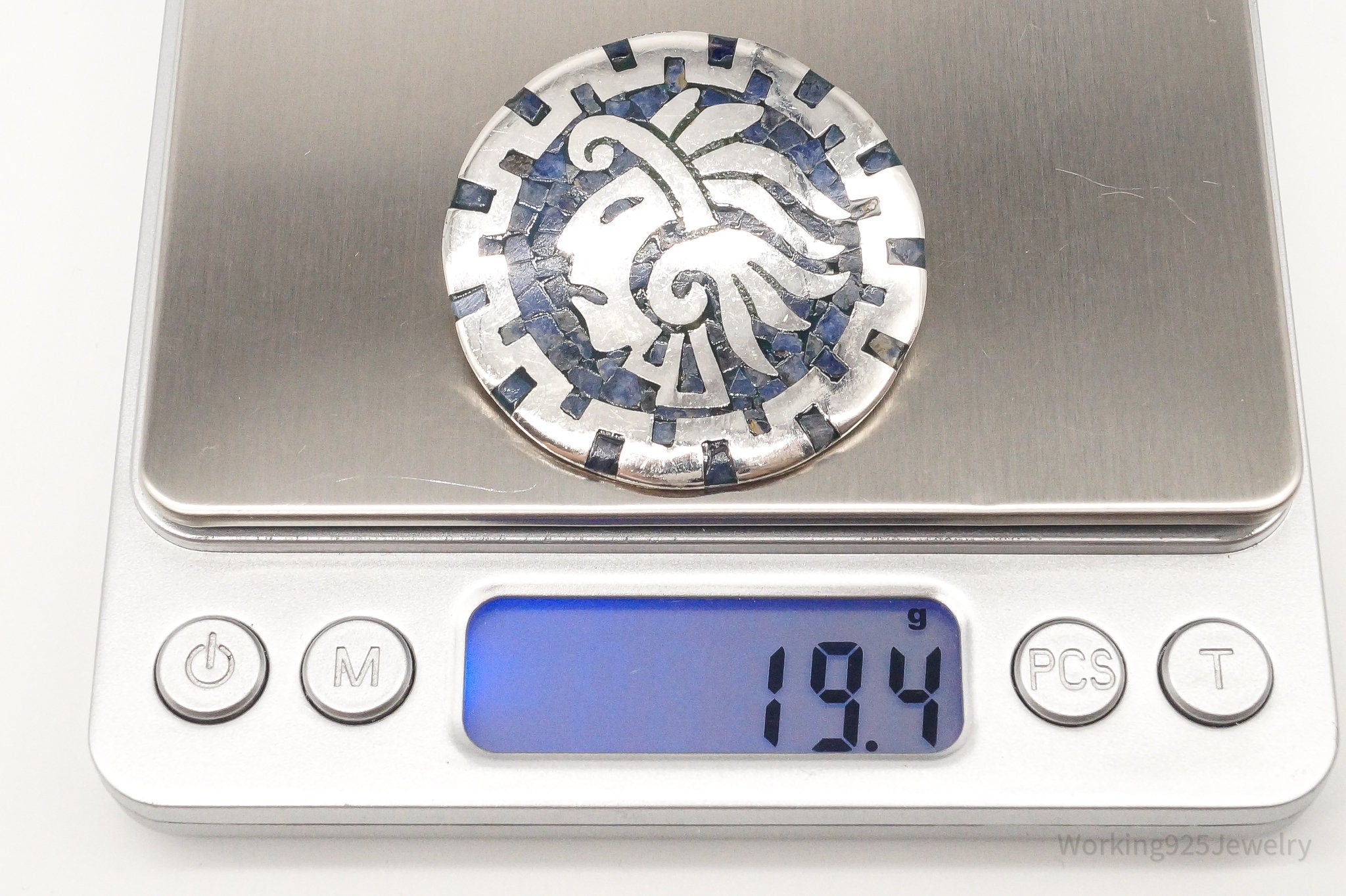 Vintage Mexico Handmade Sodalite Inlay Aztec Sterling Silver Pendant Pin