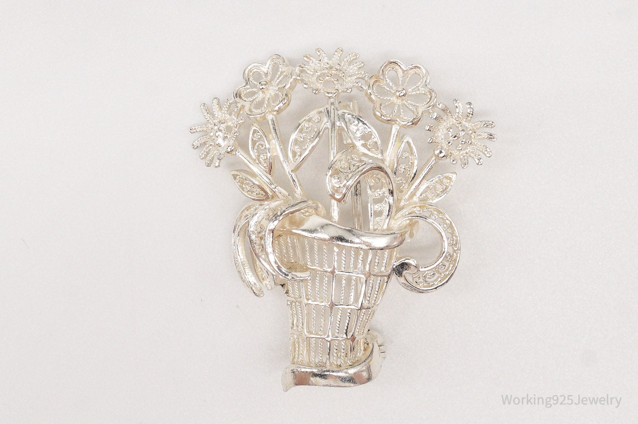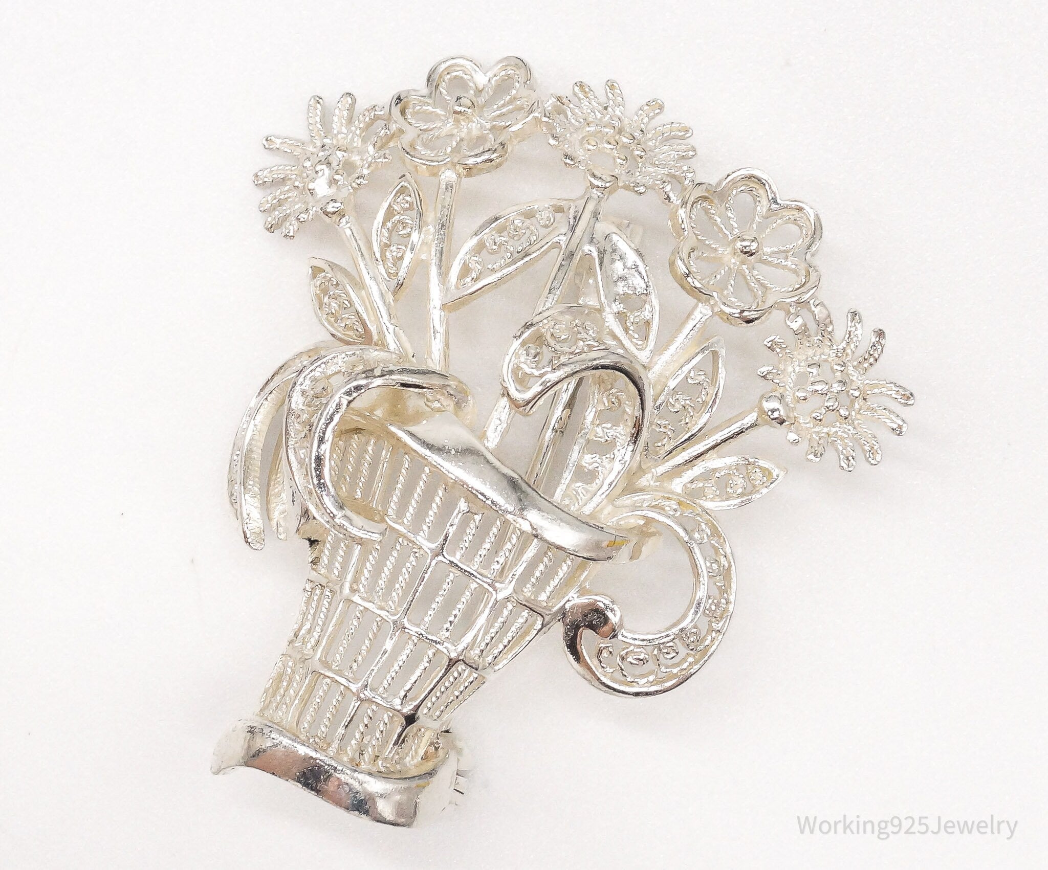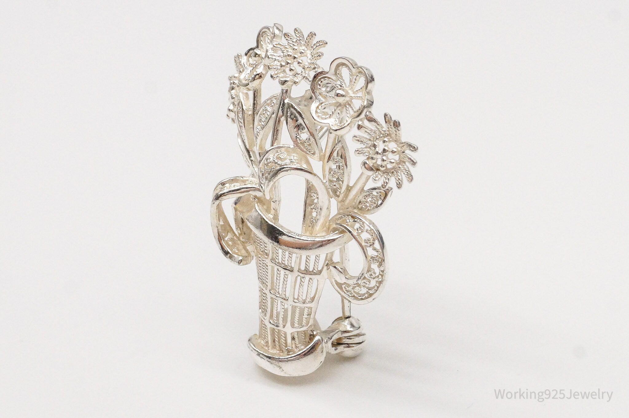 Vintage Mid Century German Sterling Silver Flower Basket Brooch Pin