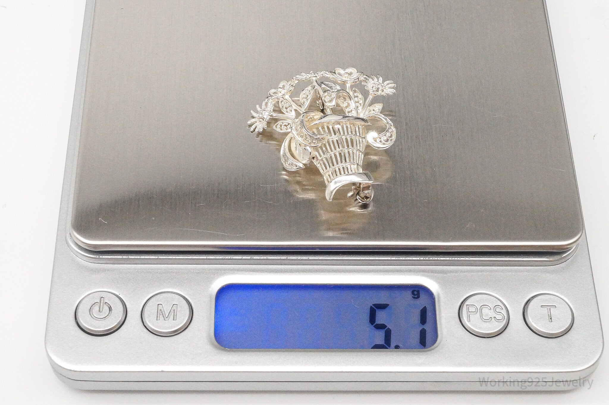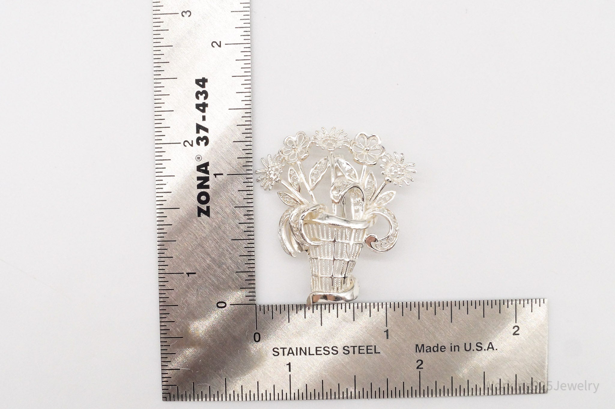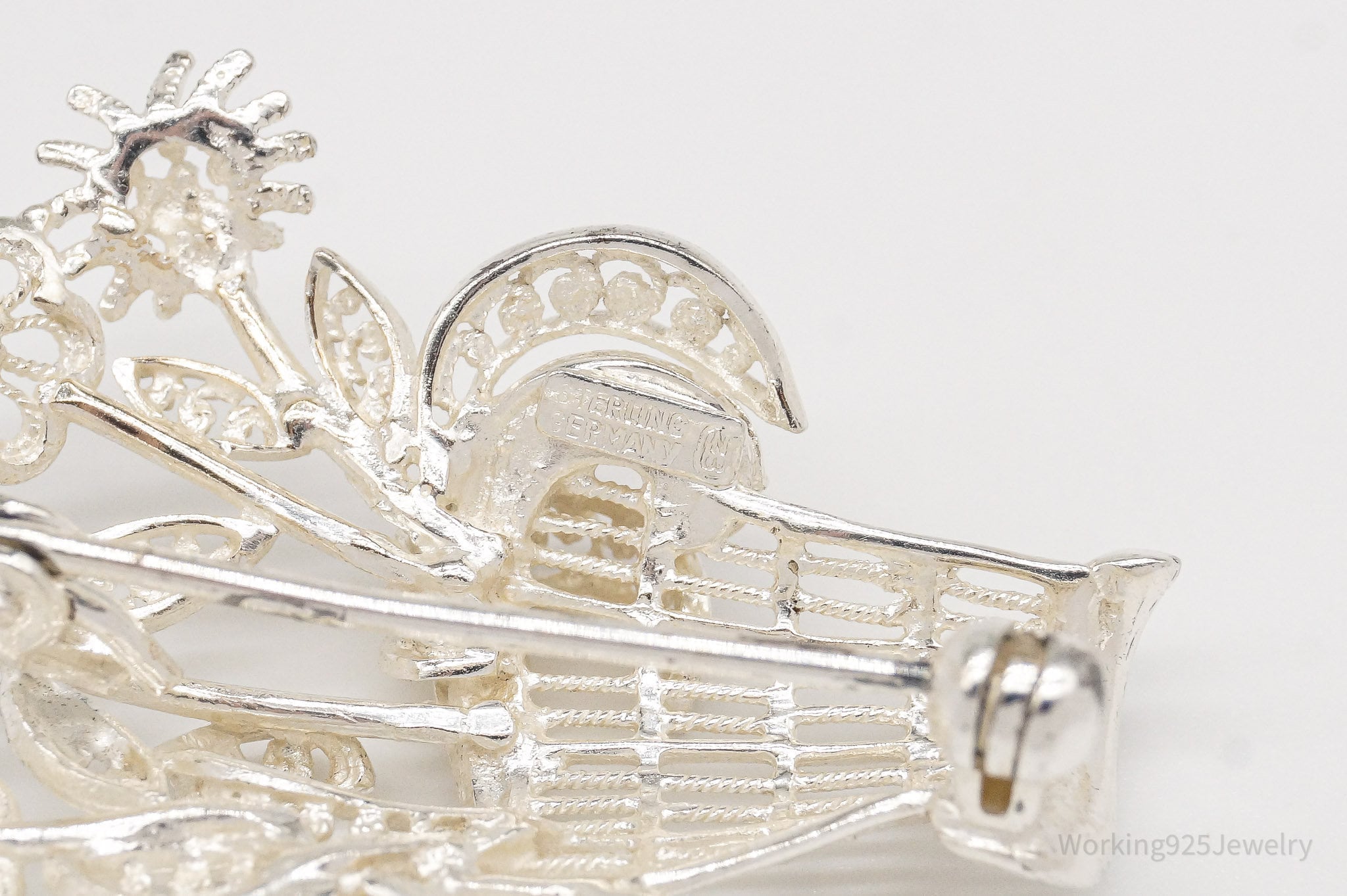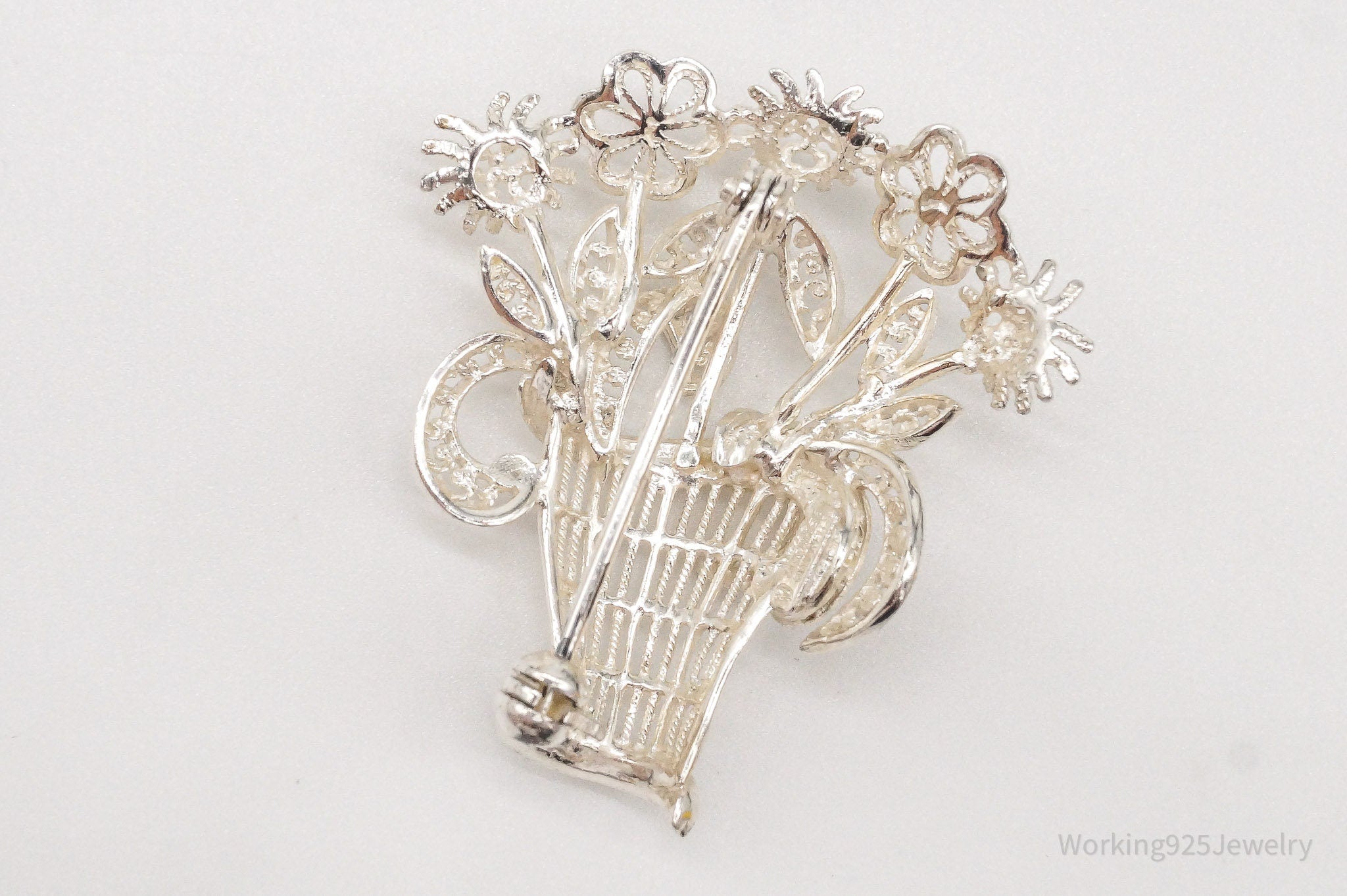 Vintage Mid Century German Sterling Silver Flower Basket Brooch Pin