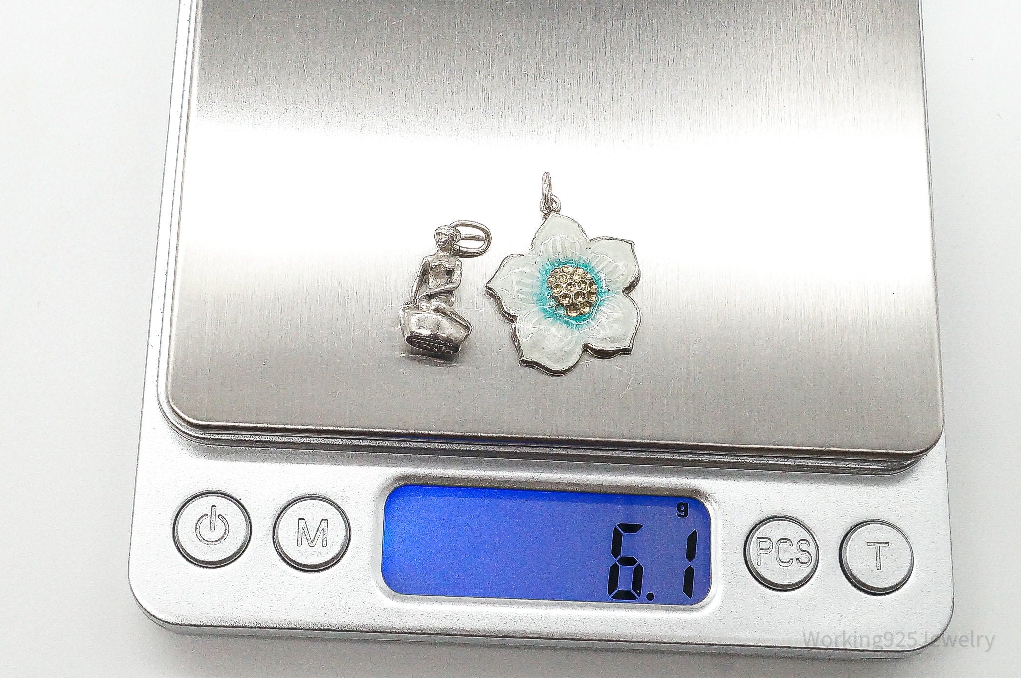 Vintage Modernist Enamel Flower Little Mermaid Sterling Silver Pendants