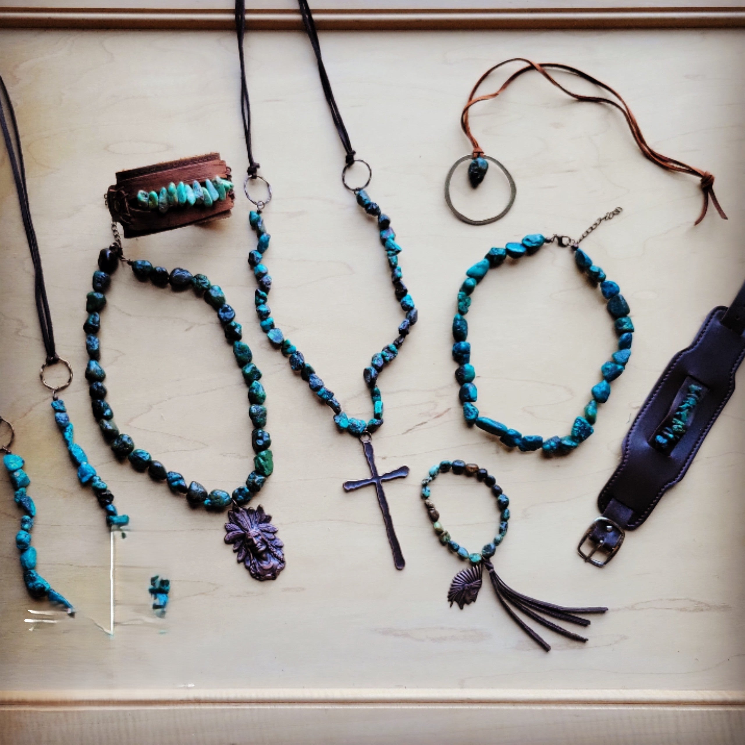 This genuine leather cuff, handmade in Texas, features Natural Turquoise chunks that add a touch of rustic charm. Each cuff is unique, adding to its individual character and appeal. Elevate any outfit with this stylish and authentic accessory. Each strand of natural turquoise is different and will show varying shades of the natural stone.