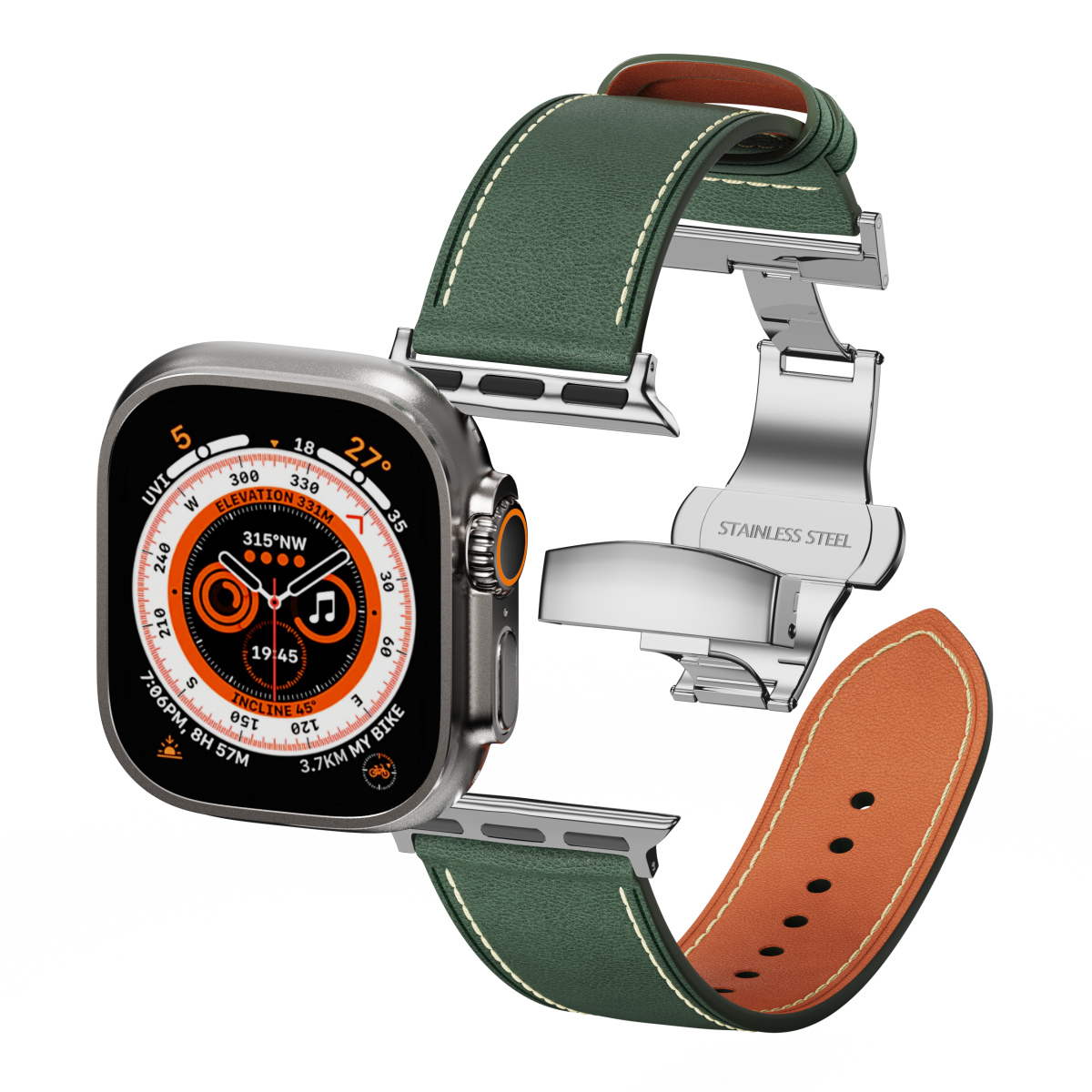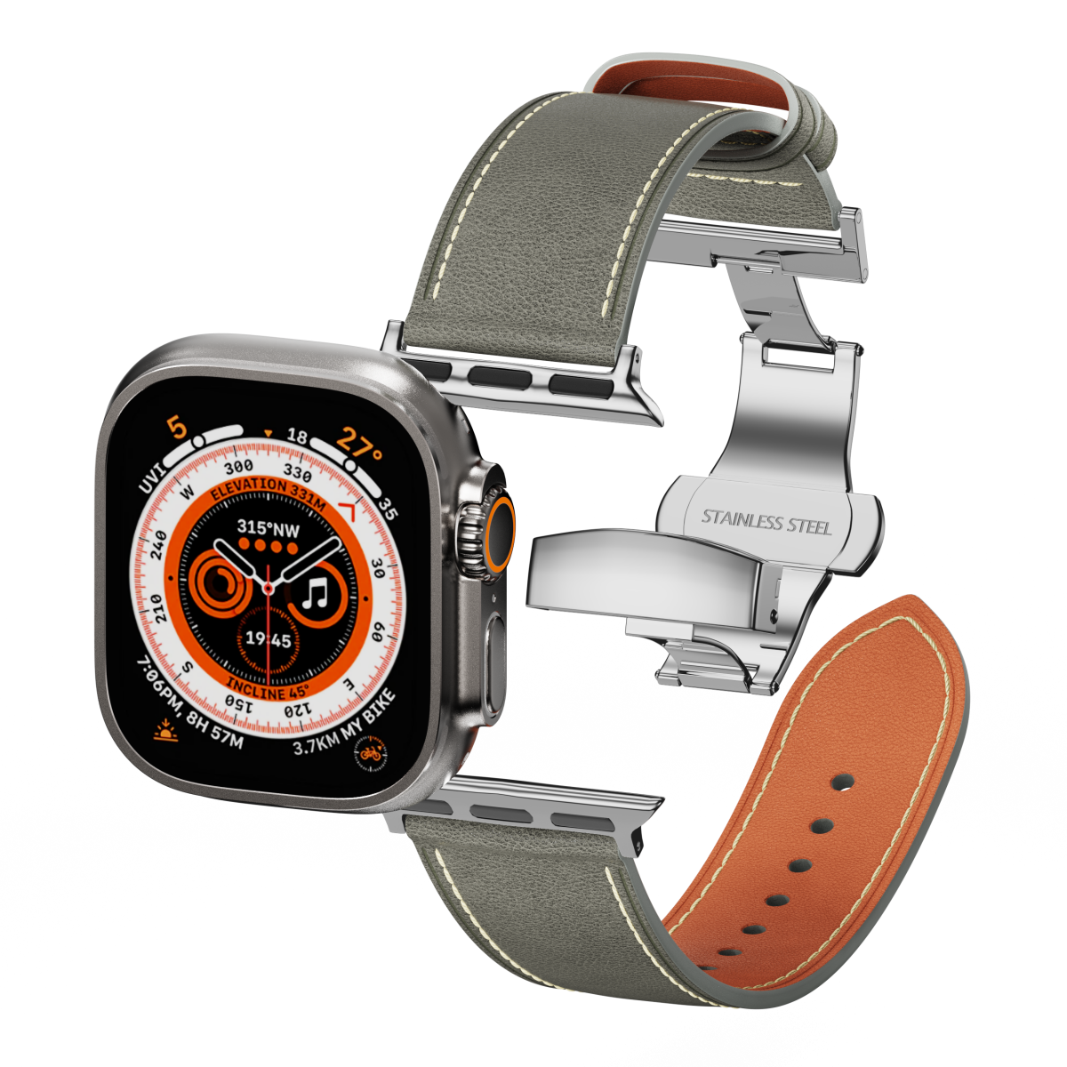 Crafted from 100% genuine top-grain leather with a sleek silver stainless steel butterfly buckle, this Apple Watch band combines classic sophistication with modern design. The supple leather ensures all-day comfort, making it perfect for board meetings, casual weekends, or intense workouts.