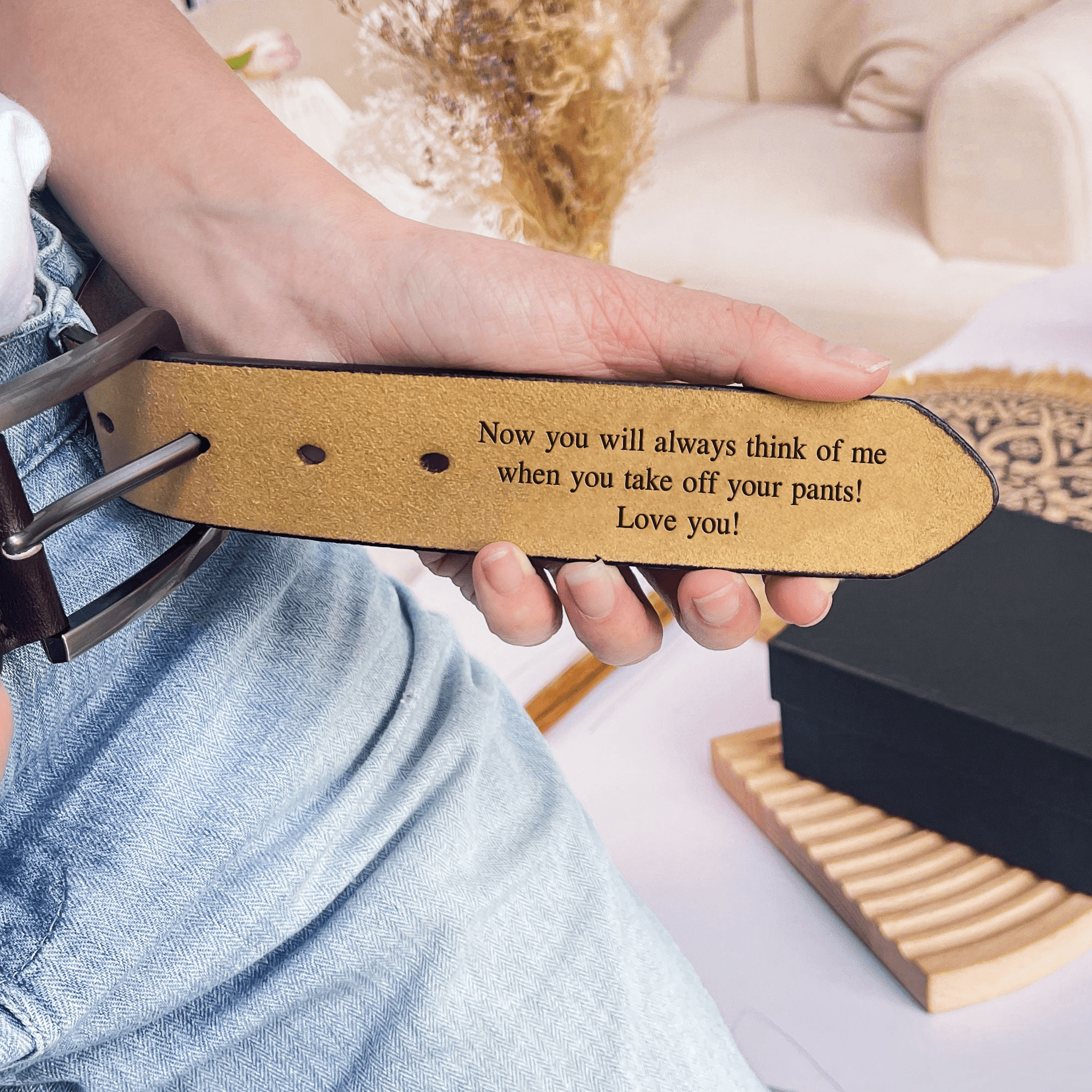 Engraved Leather Belt for Him - Think Of Me When You Take Off - Gift for Men/Him, Husband, Boyfriend, Valentine, Anniversary, Father's Day