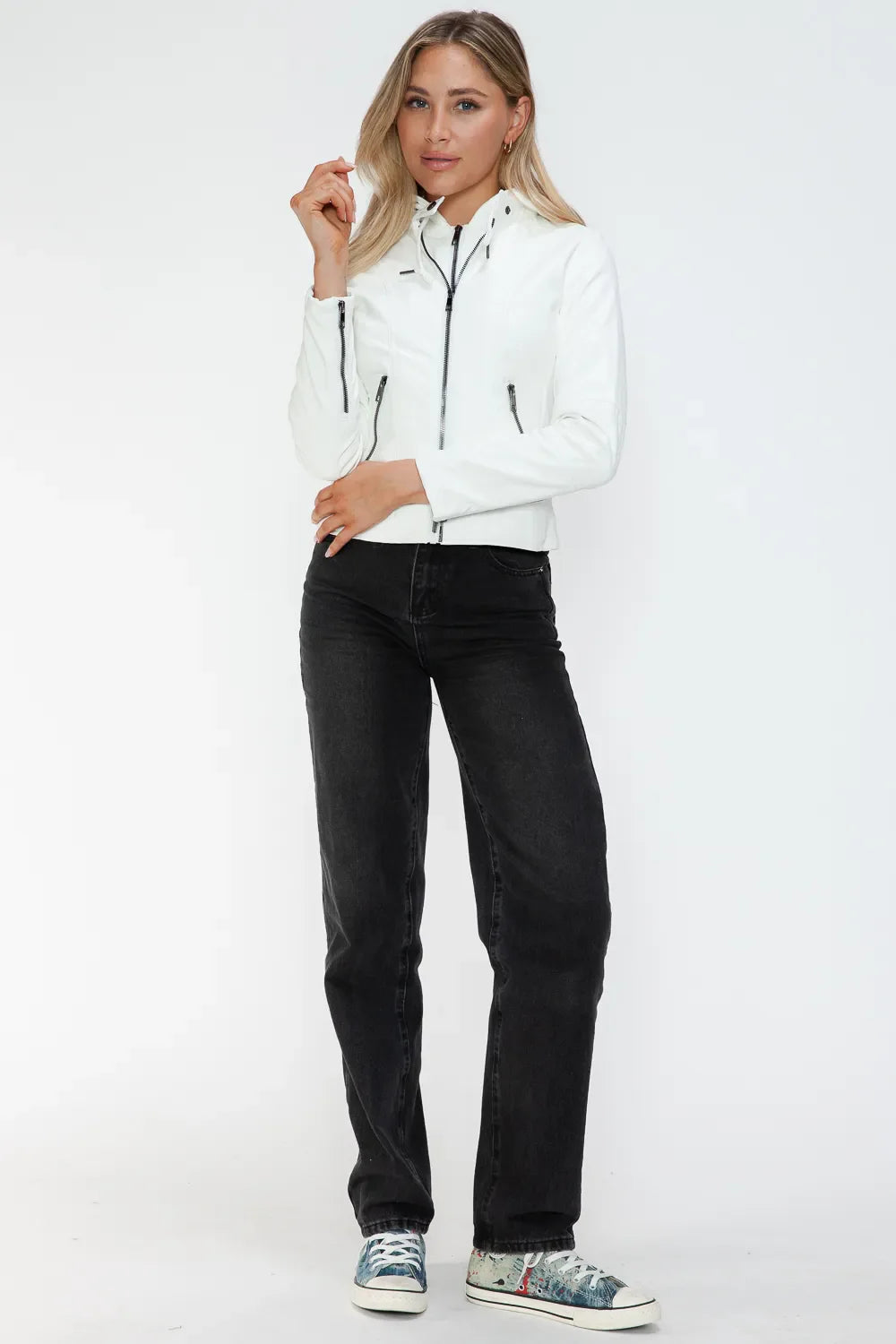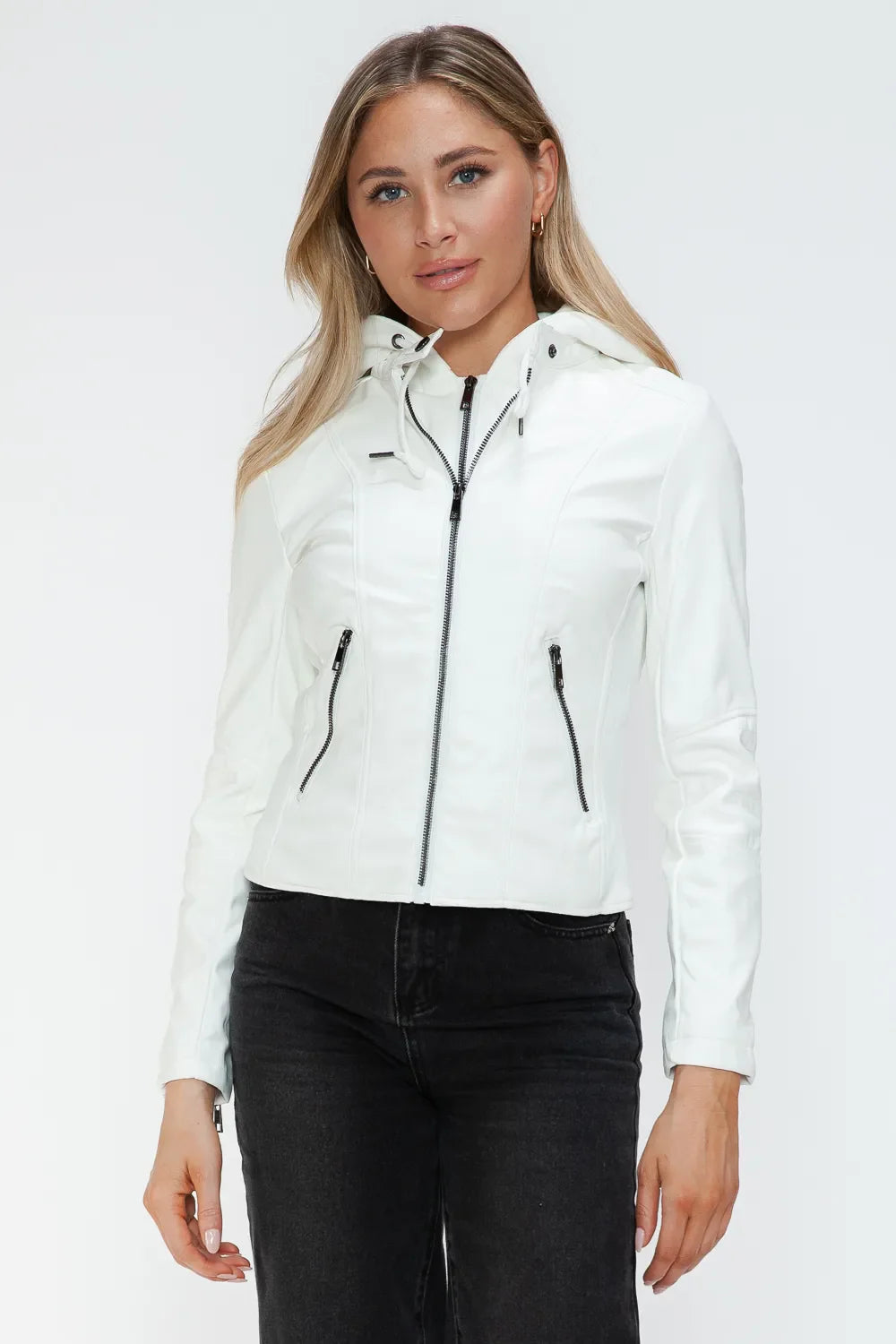 Snobbish Faux Leather Zip Up Drawstring Hooded Jacket ‐ White / S