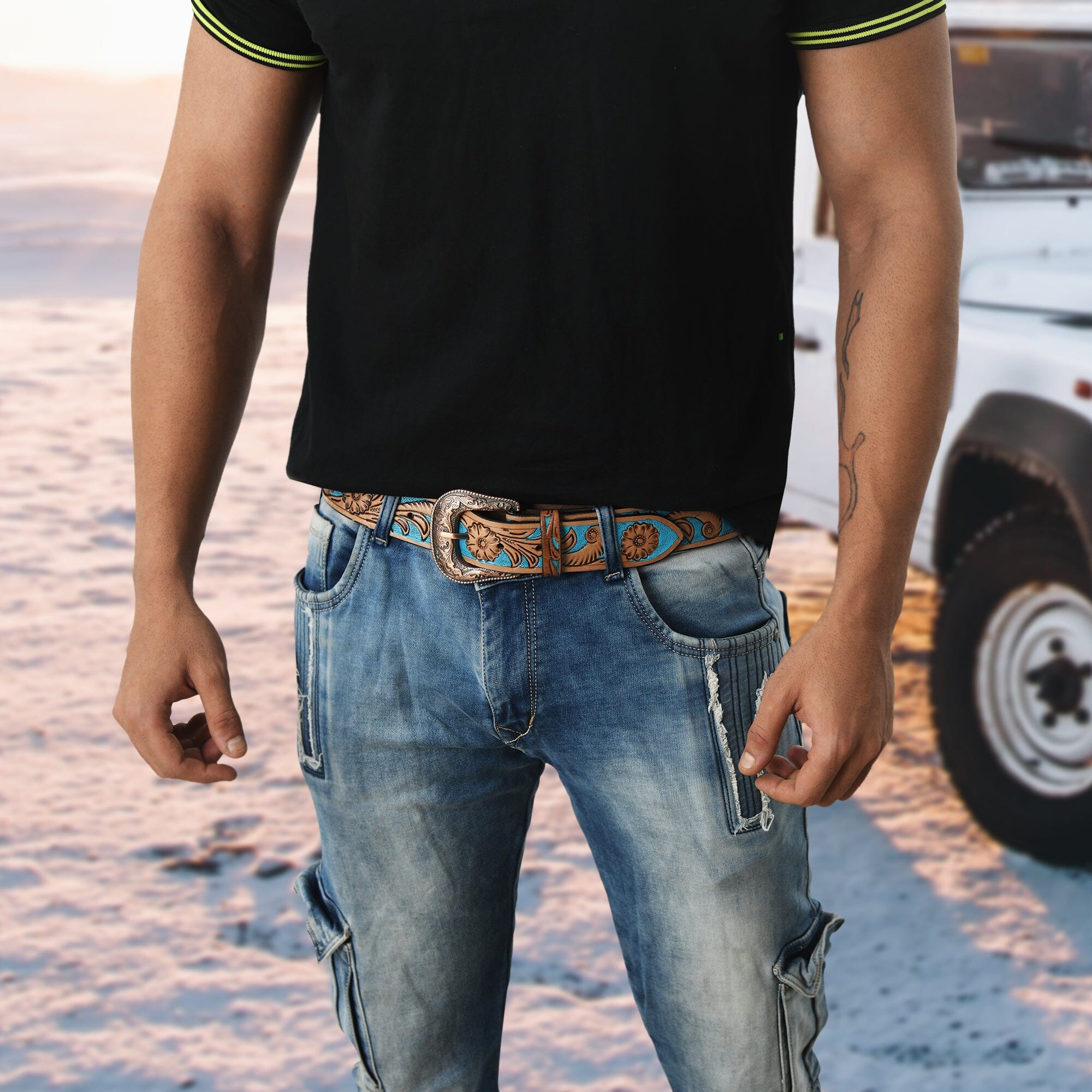 Western Cowboy Leather Belt - Blue & Brown ‐ 38" Waist