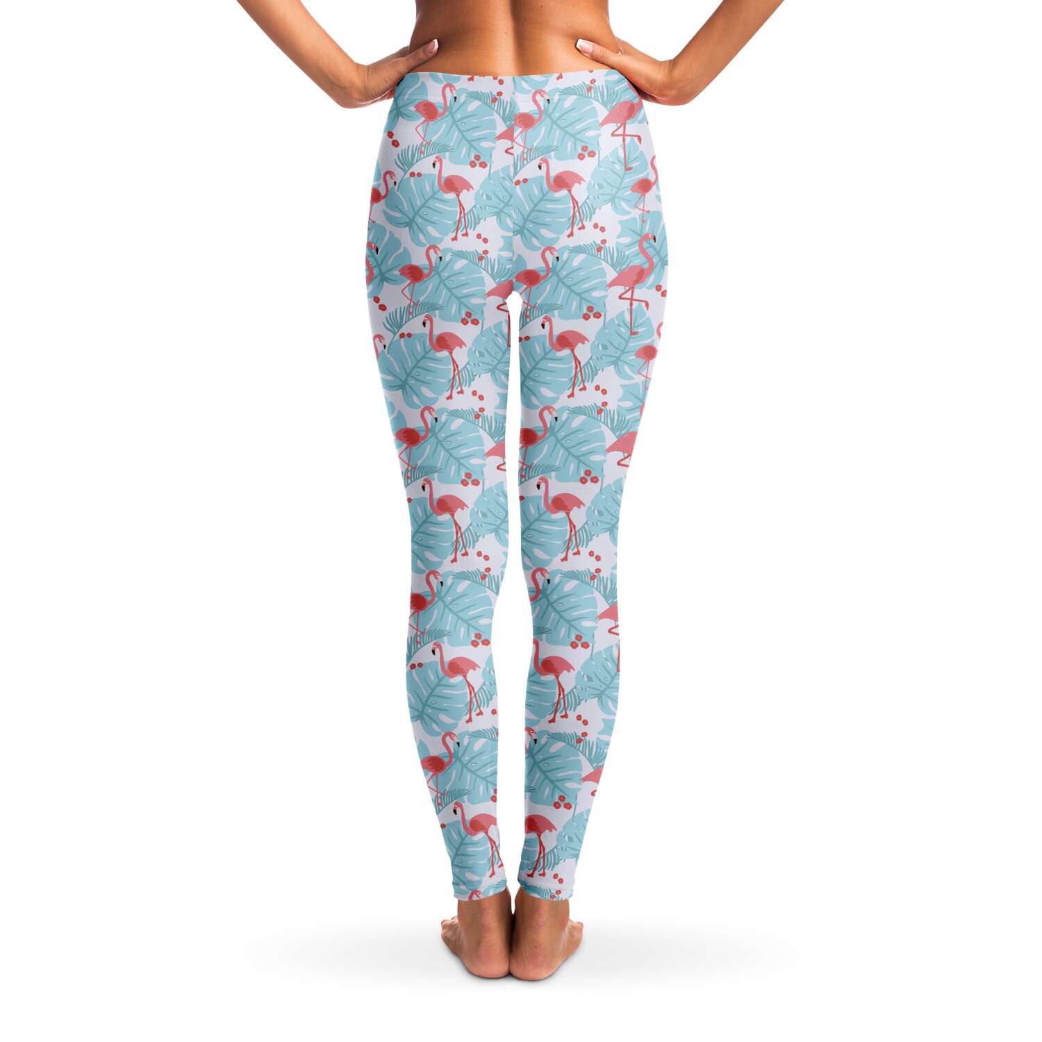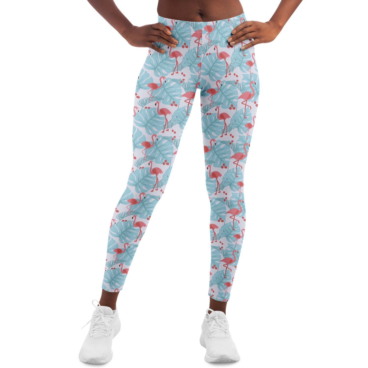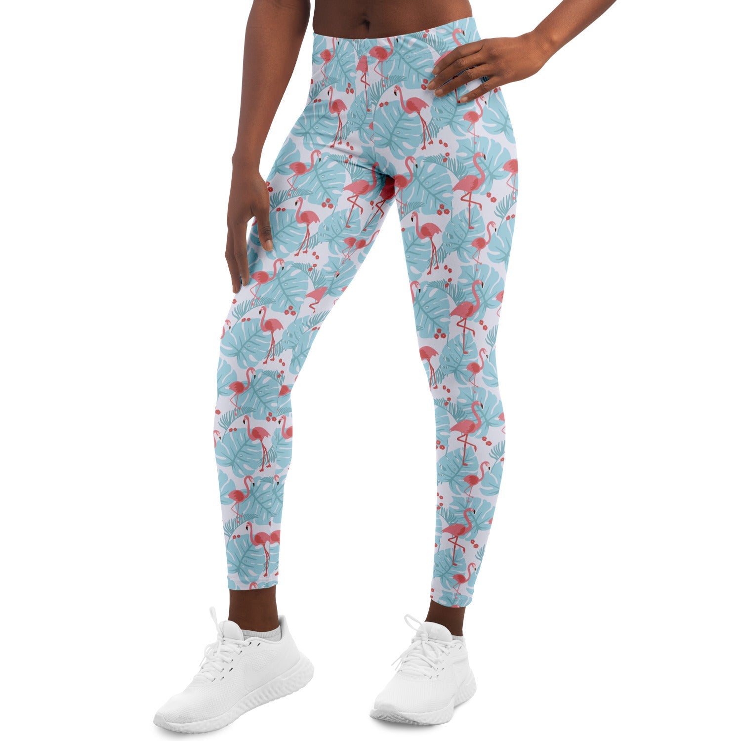 Made from 100% recycled polyester, these flamingo leggings are comfortable, fashionable, and a colorful celebration of the beautiful bird! With a four-way stretch, elastic waistband, and microfiber yarn, this excellent item of flamingo merch is a pleasure to wear for all casual occasions. Whether you're running errands, going for a run, hanging out with friends, or anything in between, you'll be cozy and snug with your flamingo friends right along for the ride!