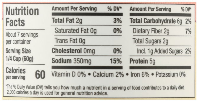 Nutrition Facts: Servings per container: 7, Size: 1/4Cup (60g), Amount/serving: Calories 60, Total Fat 2g (3% DV), Sat. Fat 0g (0% DV), Trans Fat 0g, Cholest. 0mg (0% DV), Sodium 350mg (15% DV), Total Carb. 6g (2% DV), Fiber 2g (7% DV), Total Sugars 2g (Incl. 1g Added Sugars, 2% DV), Protein 5g, Vit. D 0mcg (0% DV), Calcium 10mg (2% DV), Iron 1.2mg (6% DV), Potassium 10mg (0% DV).