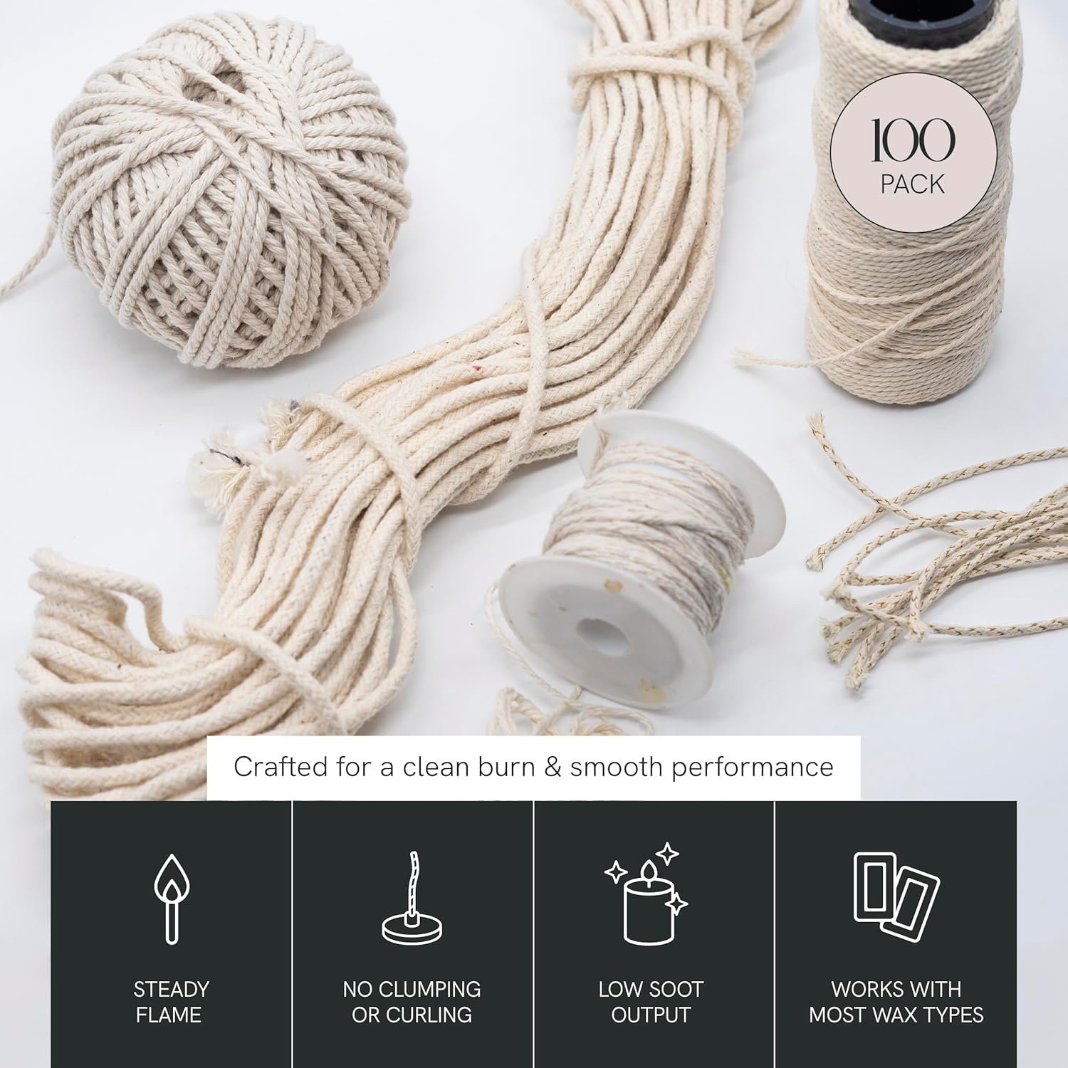 These premium cotton core wicks are expertly crafted for versatility and reliable performance across a wide range of candle styles, including votives, pillars, and container candles. Made from 100% natural fibers, each wick offers increased rigidity within the molten wax pool, promoting a steady and robust flame that enhances your candle's burn quality.