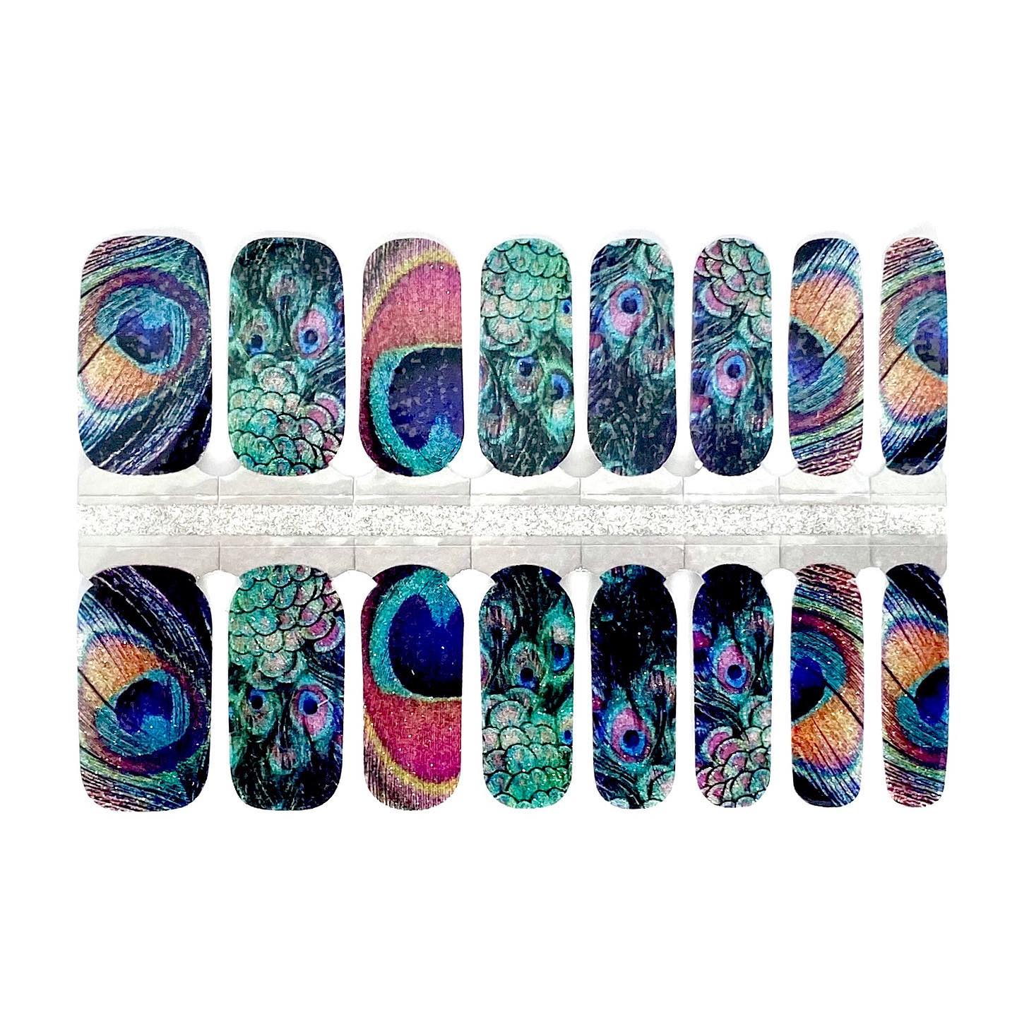 Peacock feathers symbolize vision, royalty, spirituality, protection, & watchfulness. The rich jewel tones of purple, fuchsia, and turquoise come to life in the beautiful glitter design.