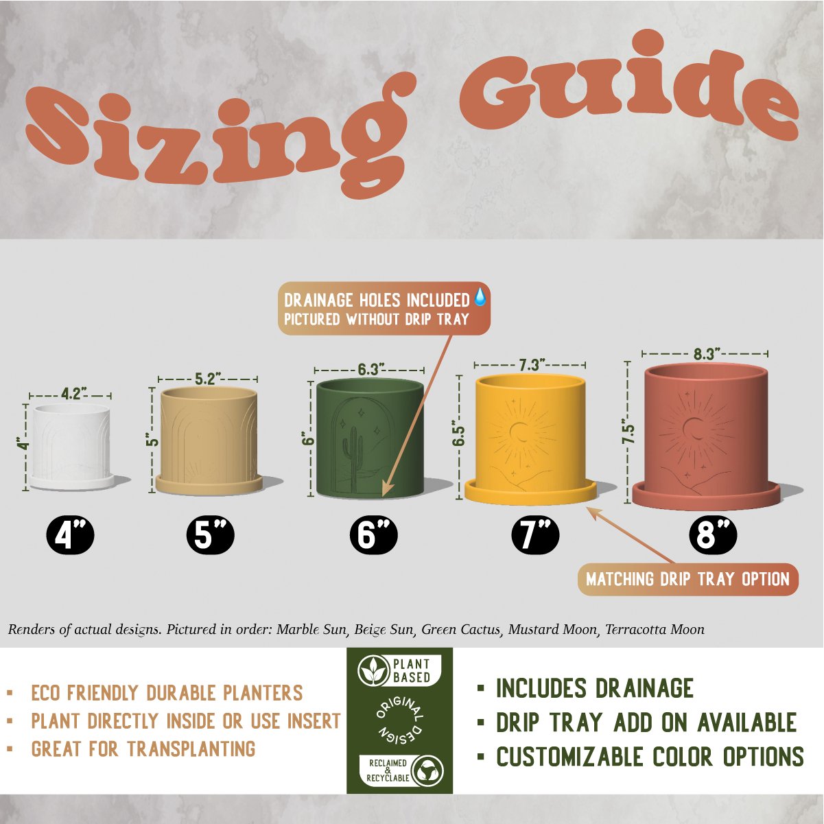 The Boho Sun planter is a great indoor planter for any houseplant. The design texture is 360 degrees of the pot and has an amazing feel. Designed to hold any 4 inch or 6 inch nursery plant, this planter comes with drainage holes and optional add-on drip tray!