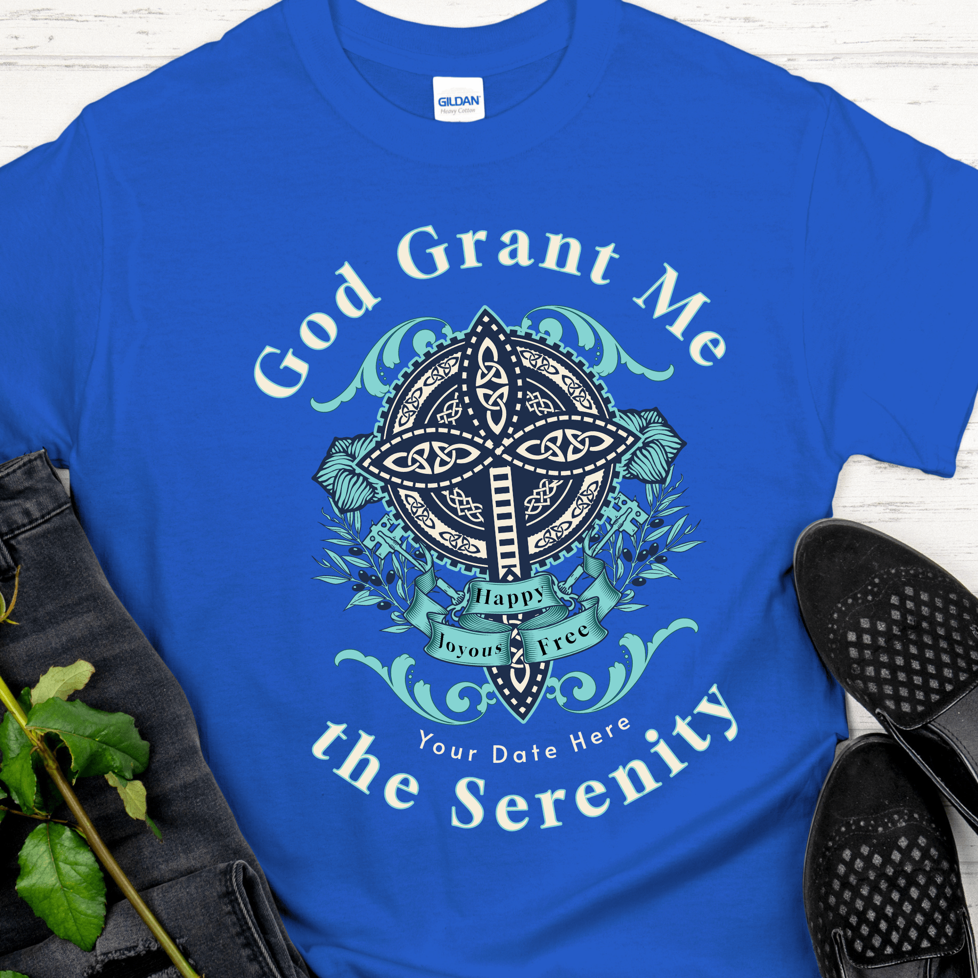 Show your support for sobriety and recovery with this inspirational T-shirt personalized with your recovery date. Featuring a bold design with nods to the Serenity Prayer and Alcoholics/Narcotics Anonymous, this is a great way to show your dedication and commitment to staying sober.