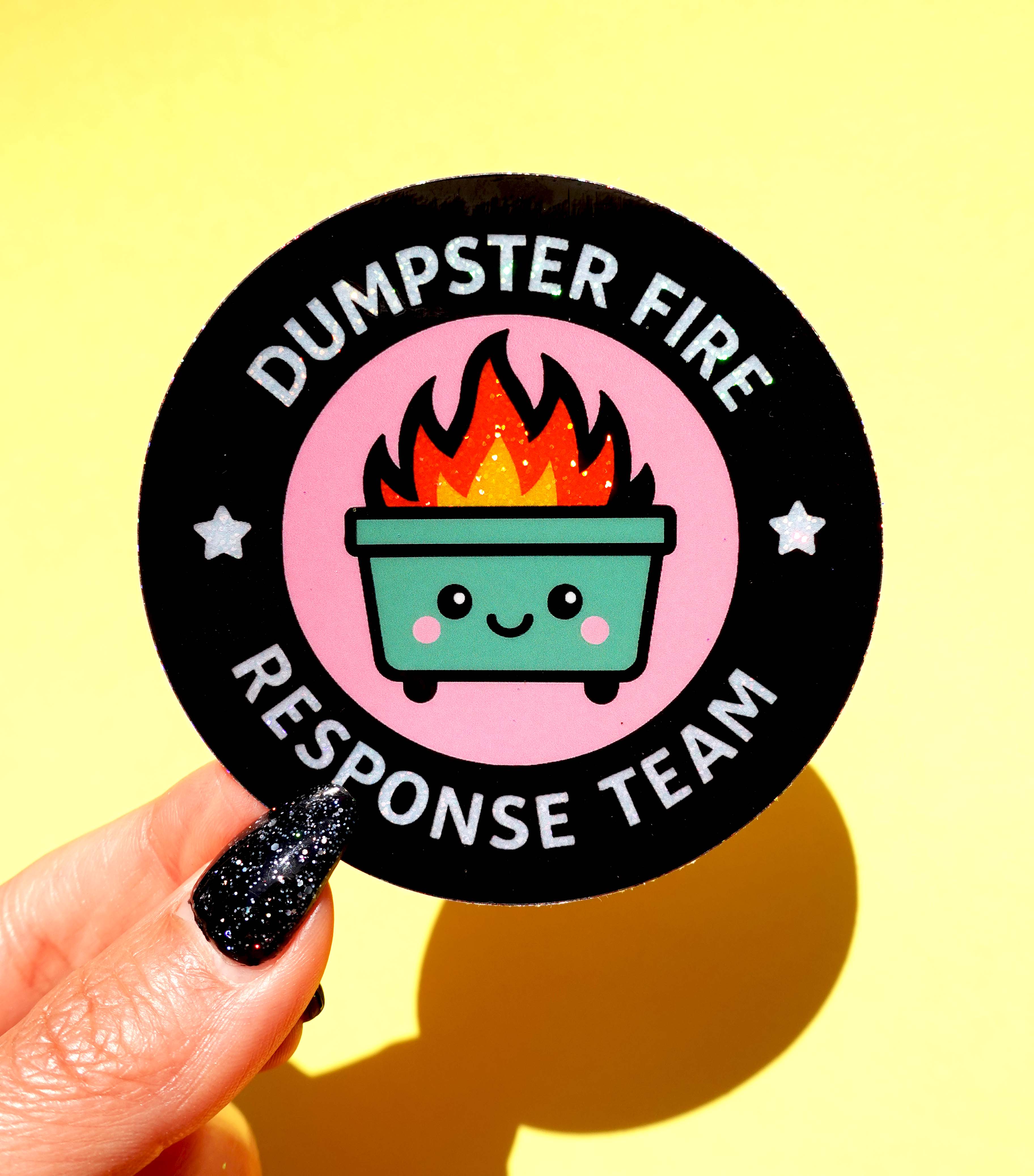 This vinyl sticker features the internet’s favorite mascot of chaos , the dumpster fire , reimagined in kawaii style with rosy cheeks, rainbow sparkles, and the official title: Dumpster Fire Response Team. It’s cute, it’s chaotic, and it’s the badge of honor you didn’t know you needed.