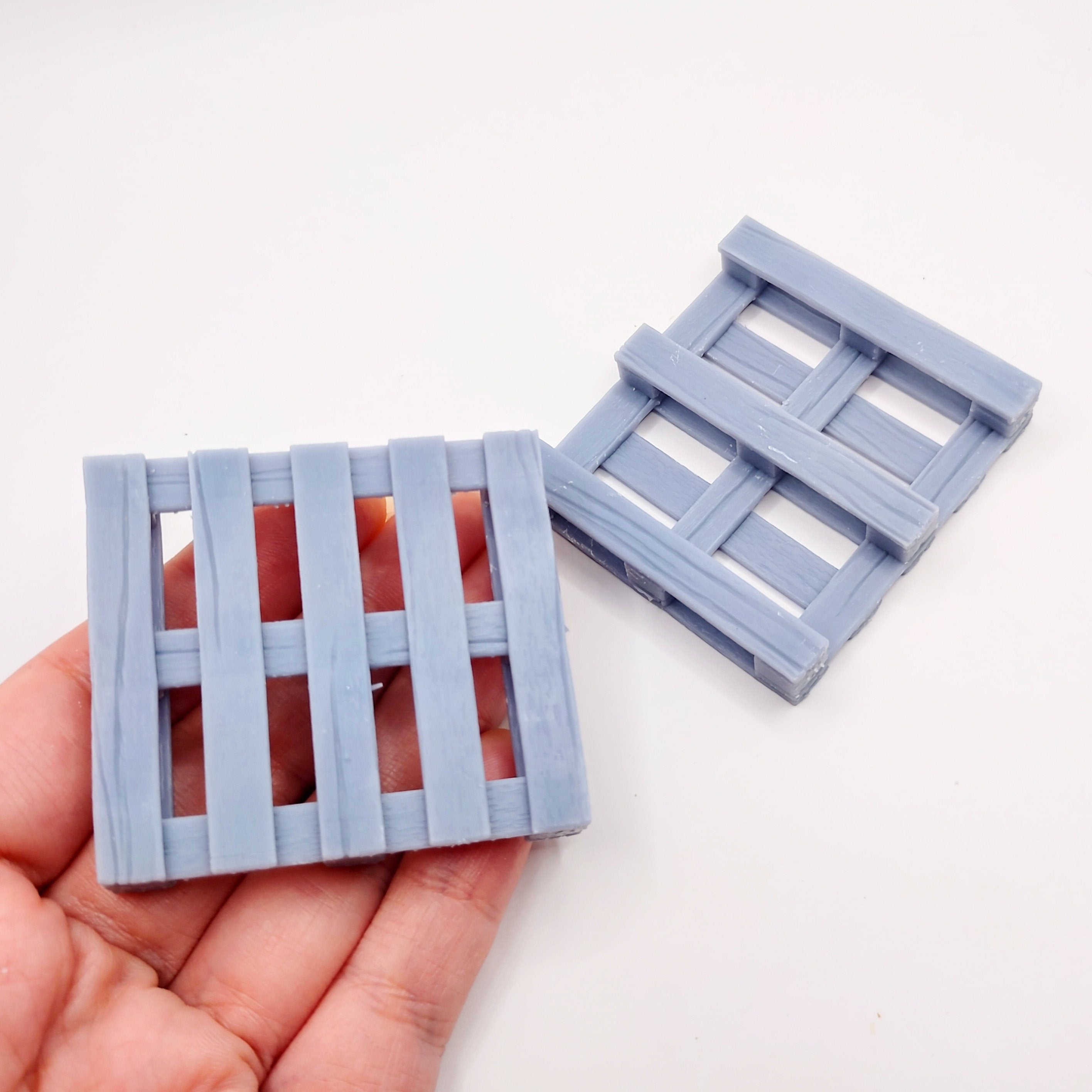 Miniature pallets made with 1:24 scale in mind. Super realistic wood texture makes for easy painting! These gorgeous pallets will compliment any of your garage or warehouse dioramas.