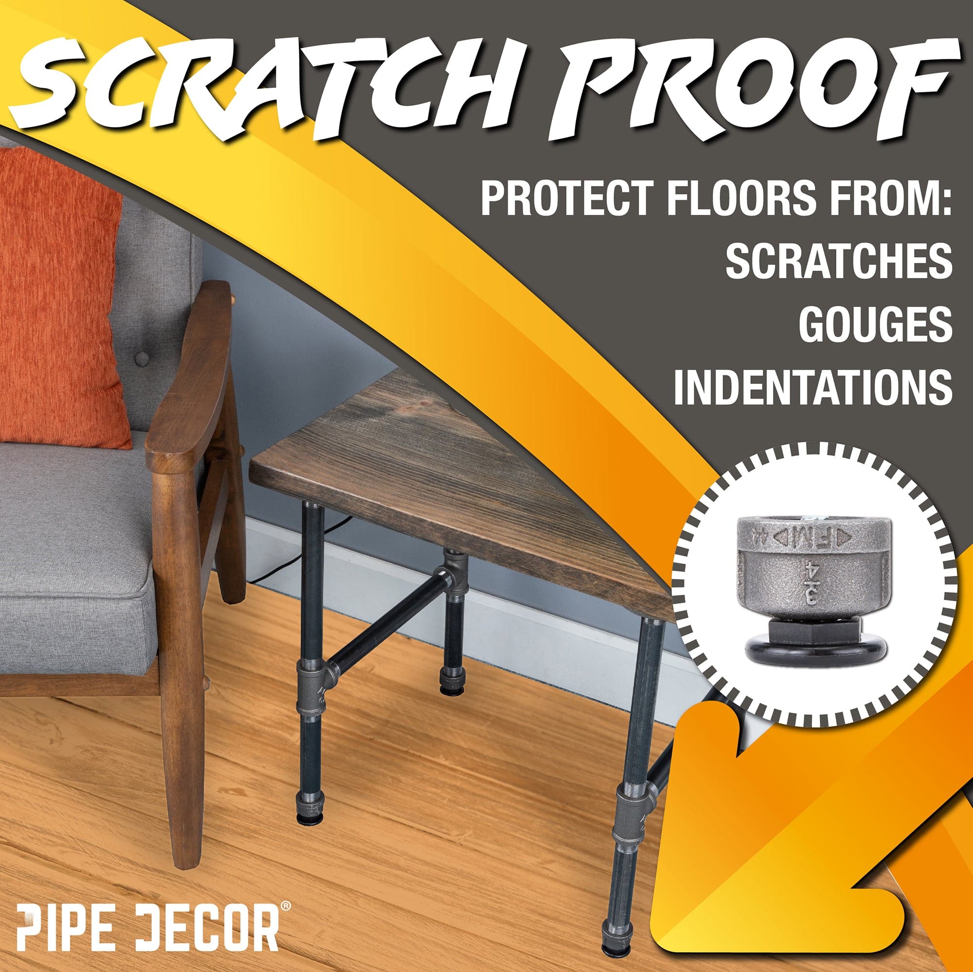 Levelers protect the floor from furniture legs that can scratch, gouge, or cause indentations. No more marring and scraping your floors when trying to rearrange your furniture. Furniture levelers help pipe furniture glide seamlessly across wood, tile, and linoleum flooring. Rearrange your furniture to achieve your perfect layout with little effort.