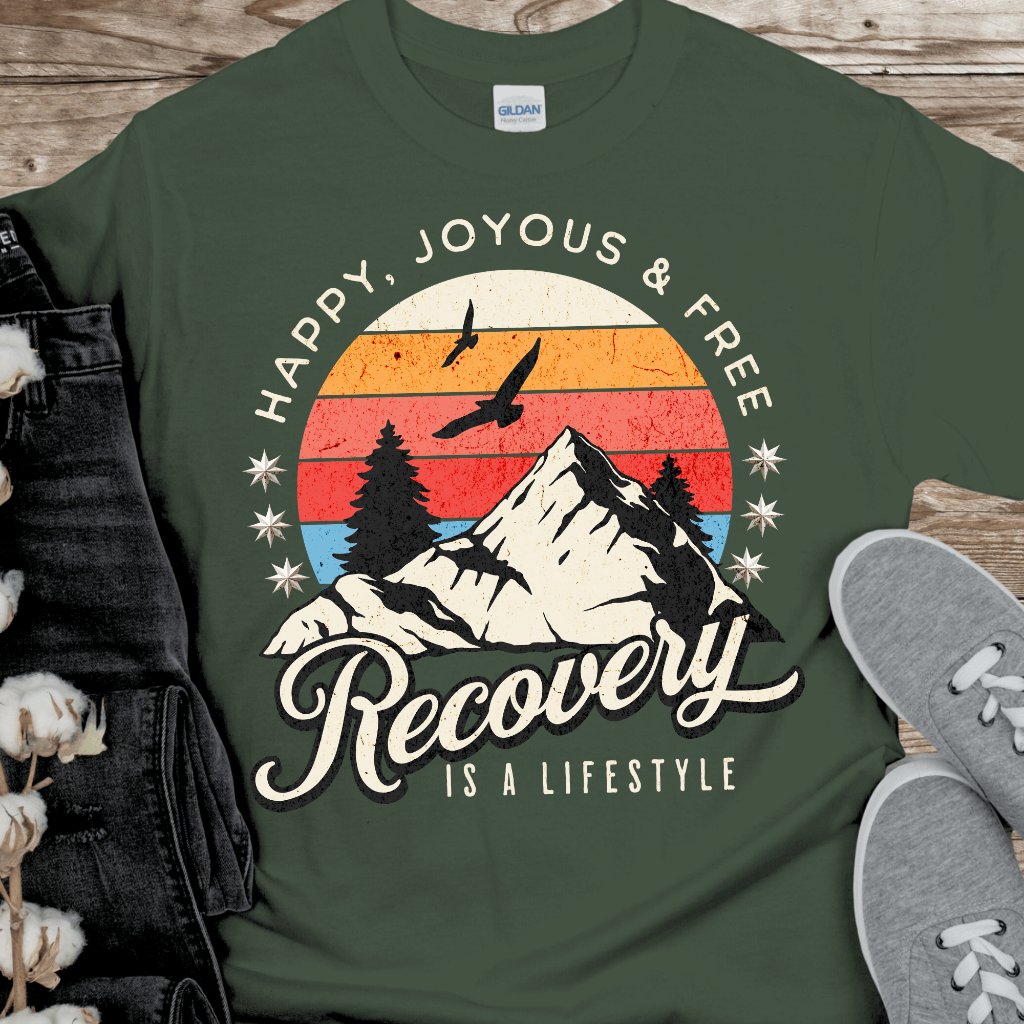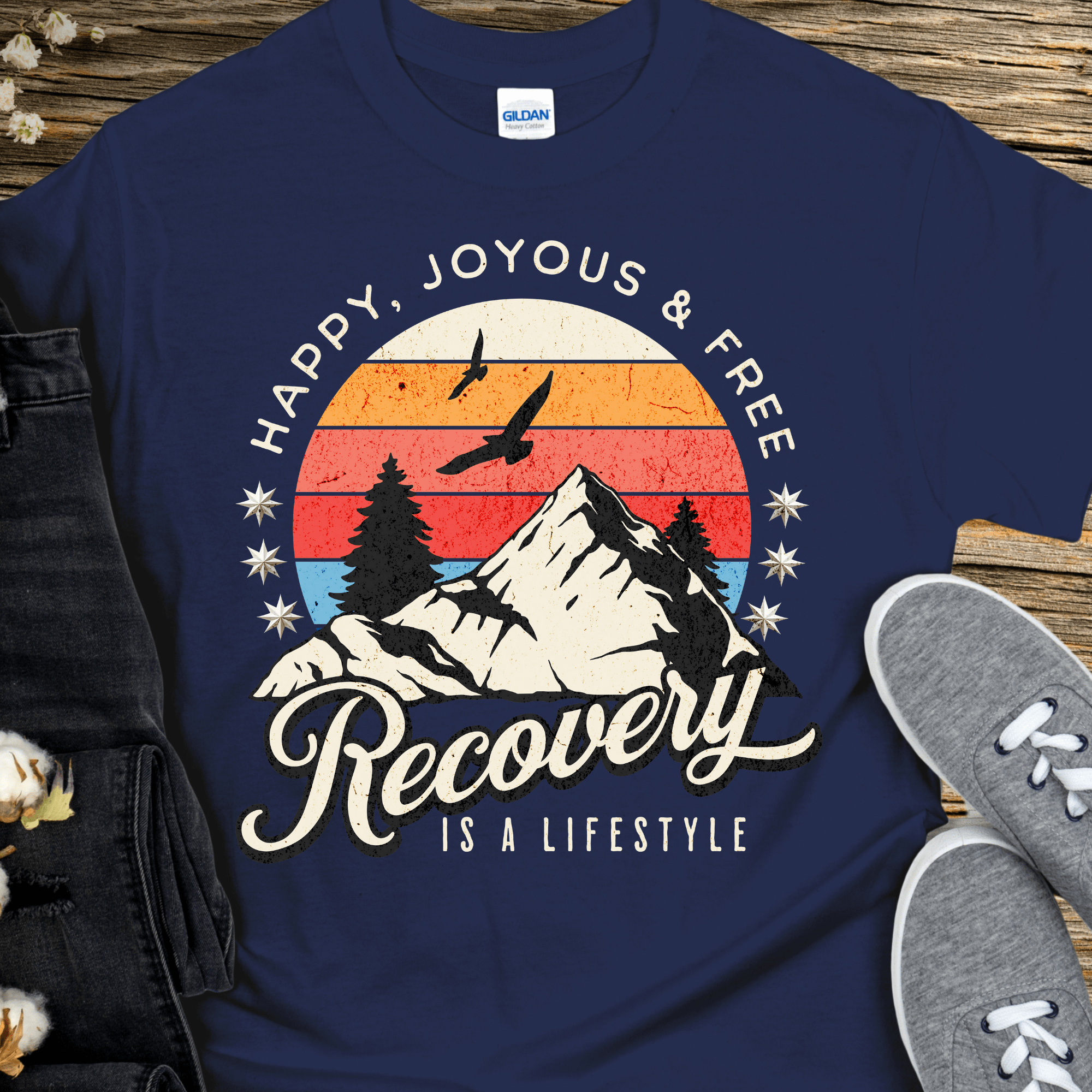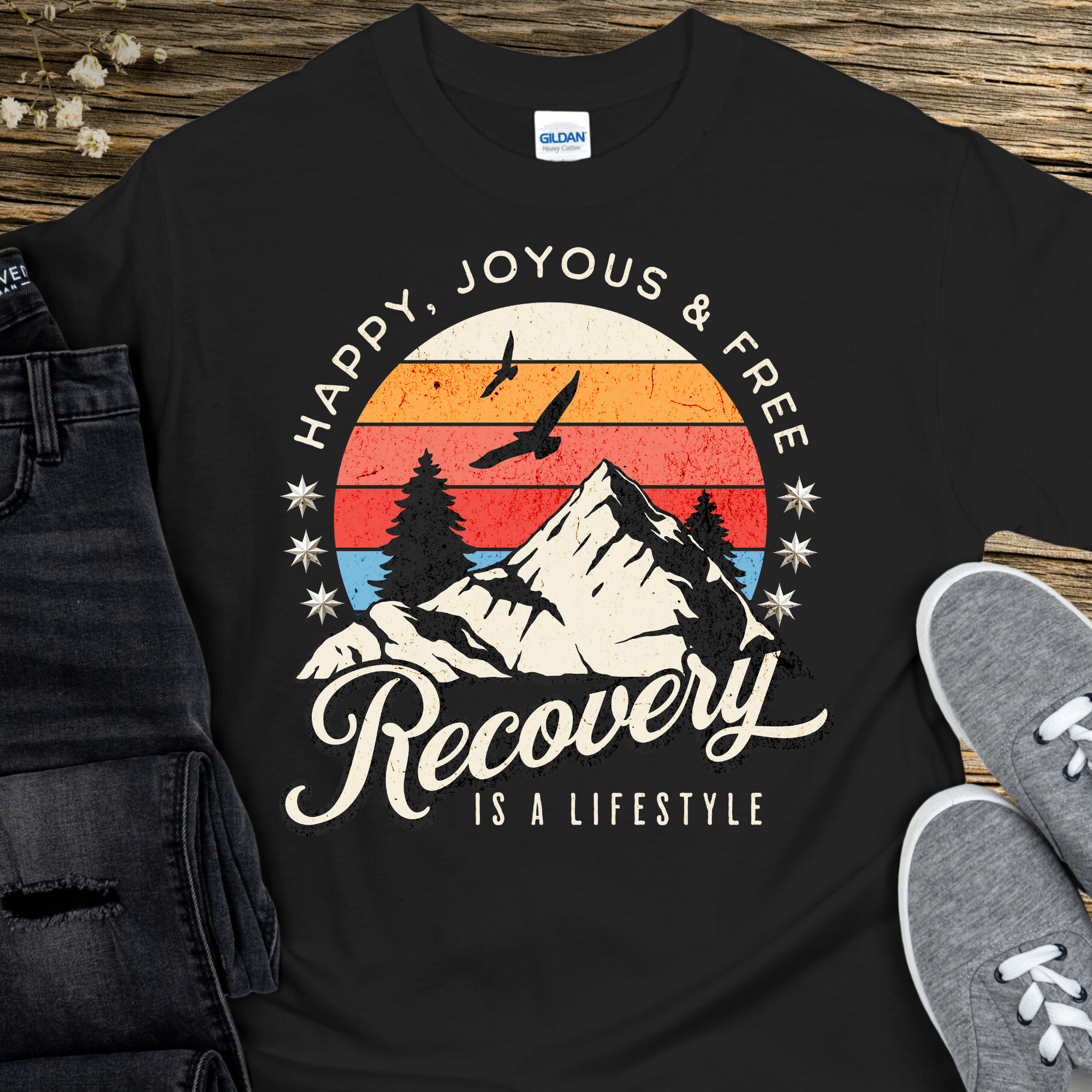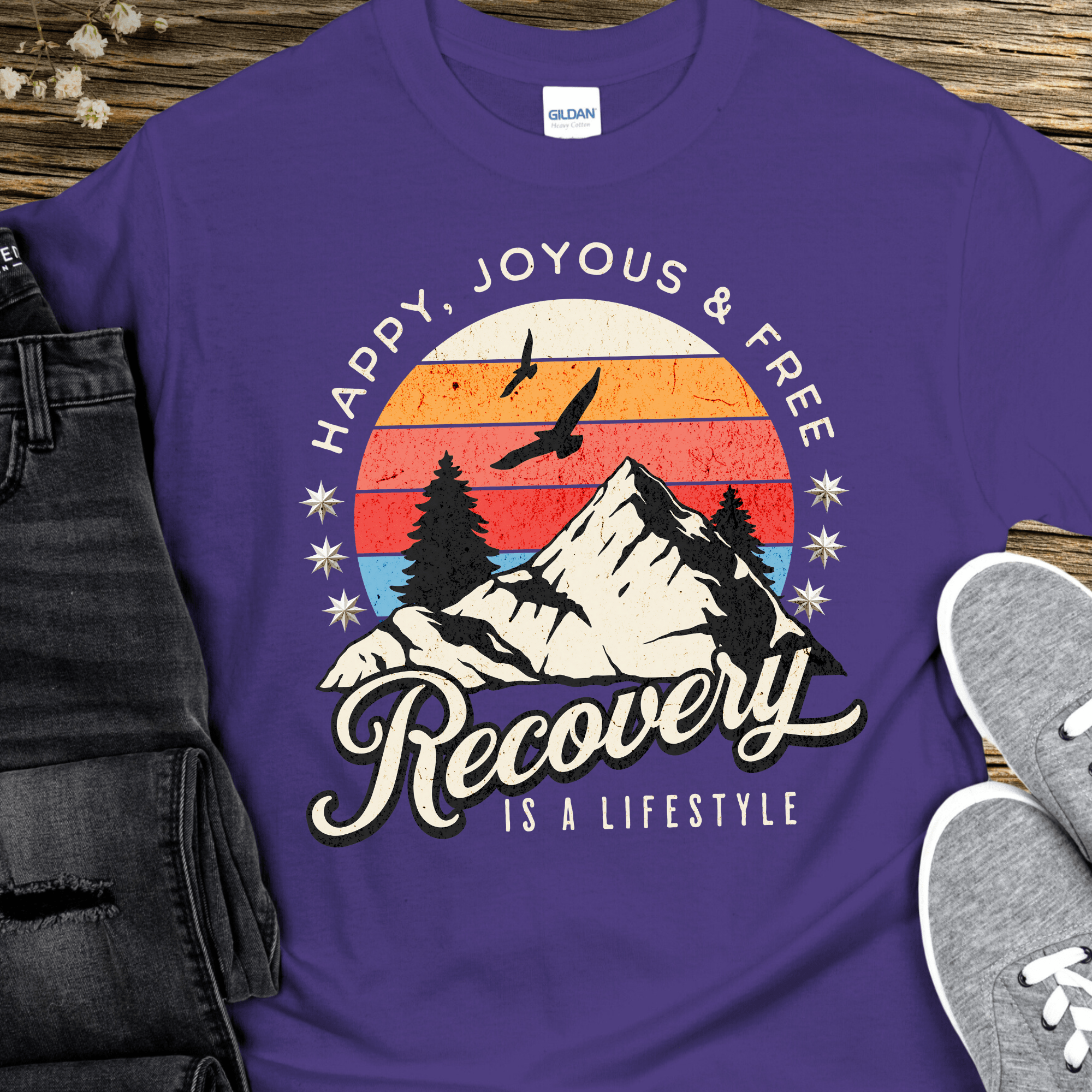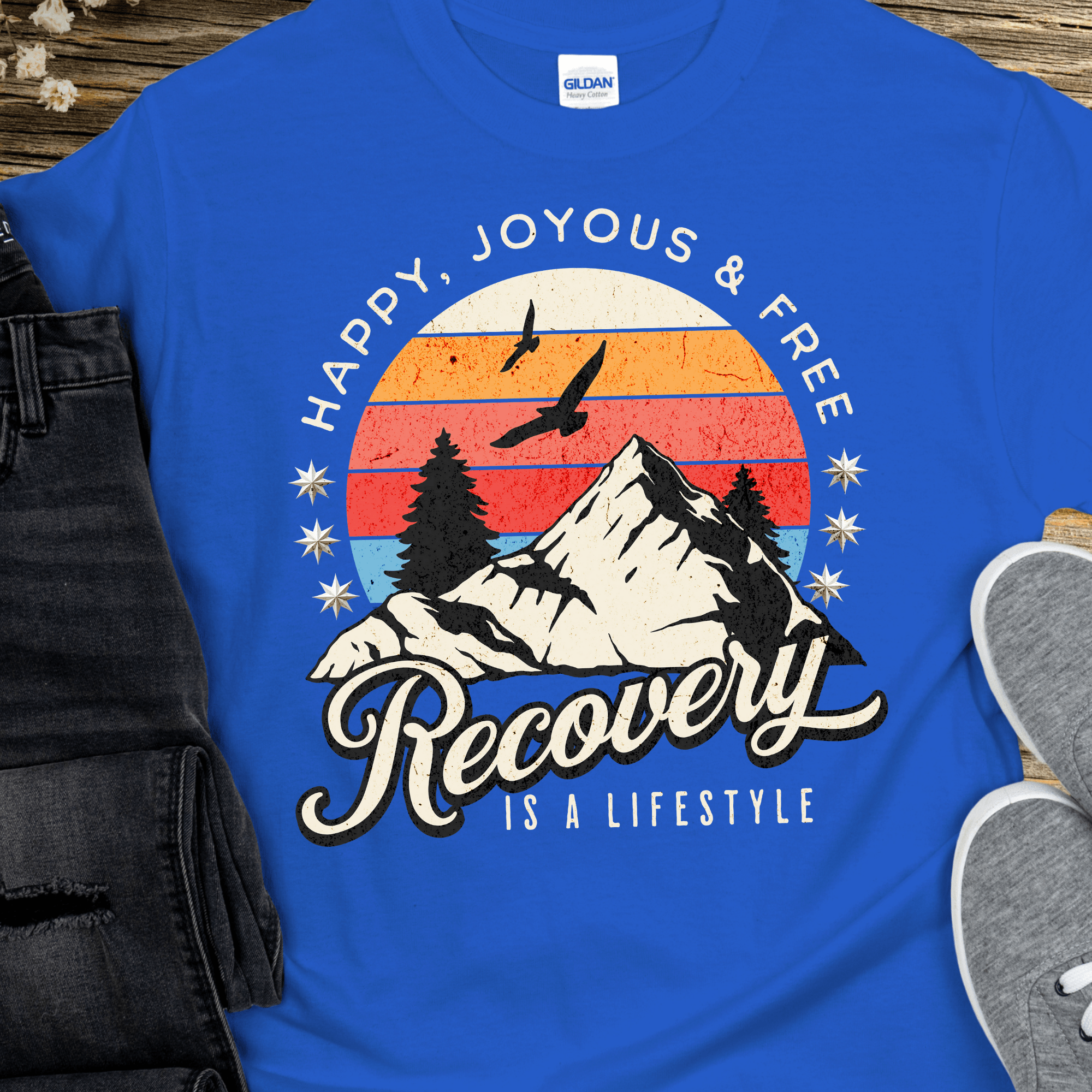 Recover fearlessly with our inspiring Recovery T-Shirt. Featuring a bold, adventurous design and the iconic phrase, "Happy Joyous and Free," this shirt showcases the true lifestyle of recovery. Embrace the challenge and adventure of sobriety with this motivating t-shirt.