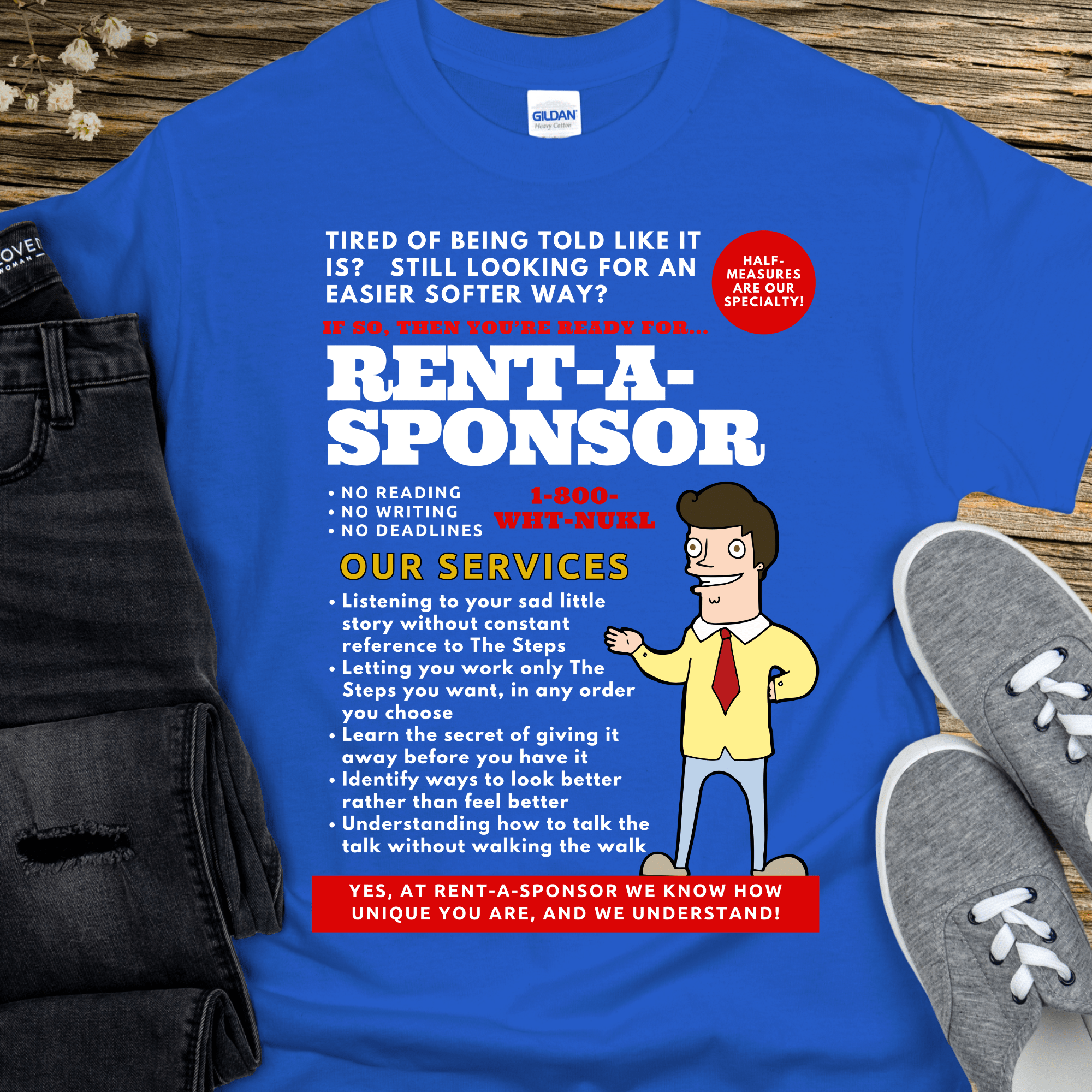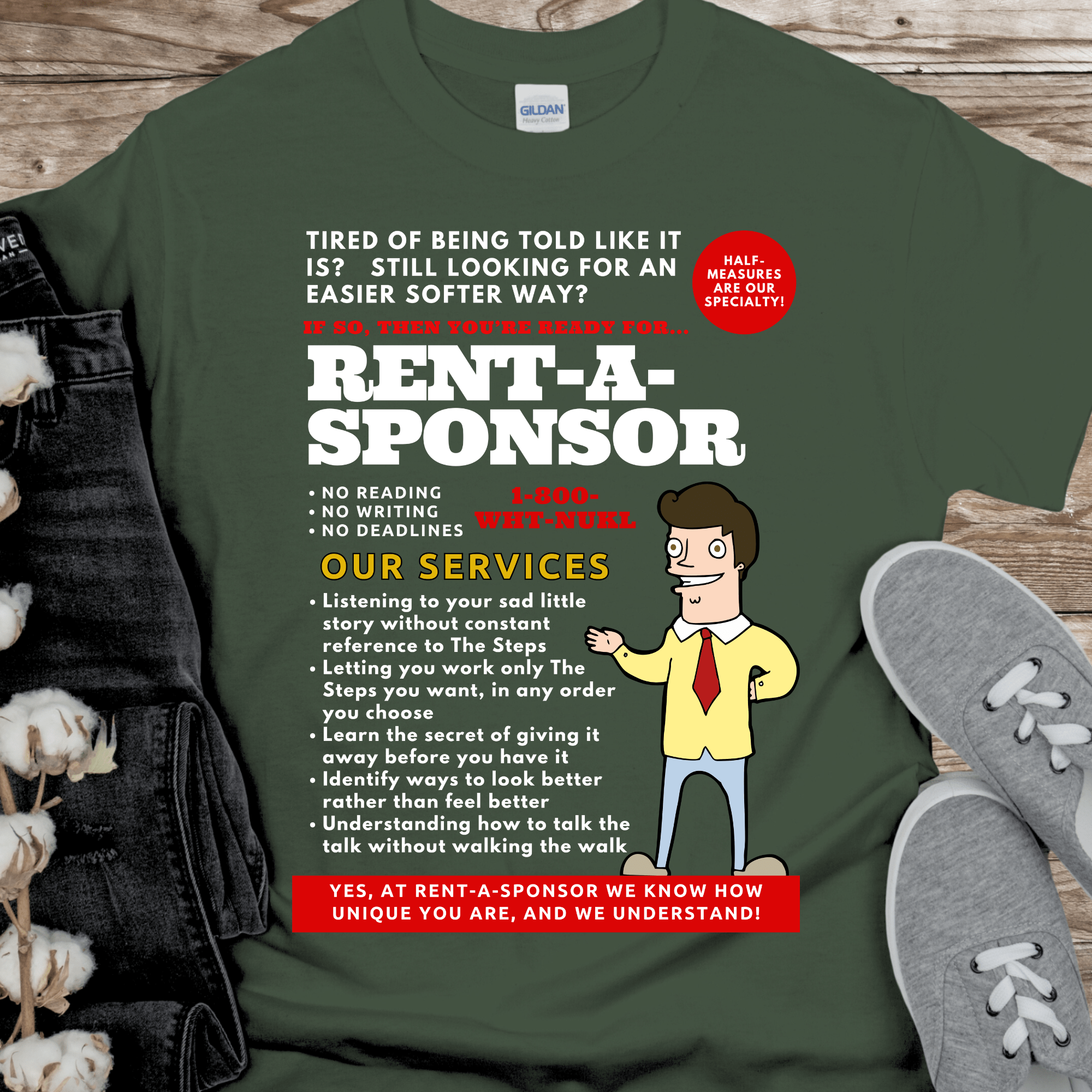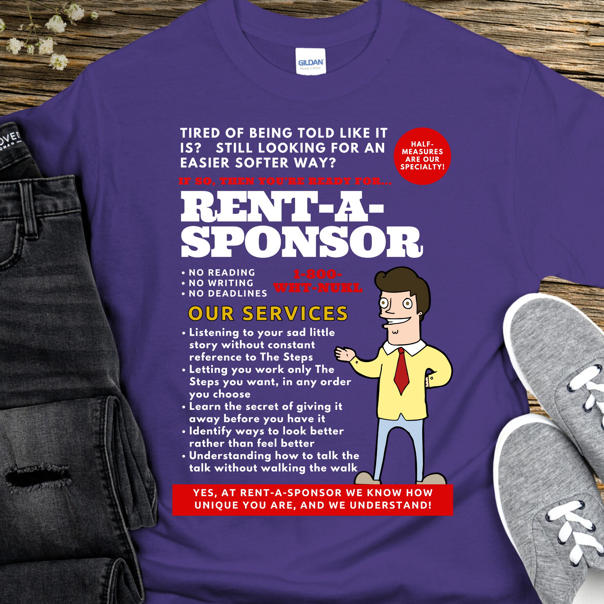 Upgrade your sobriety game with the Recovery T-Shirt from Rent-A-Sponsor! This hilarious sponsor gift features iconic phrases from AA and NA, perfect for any 12 Step Sponsor. Stay sober in style, with a playful nod to Alcoholics Anonymous and Narcotics Anonymous.