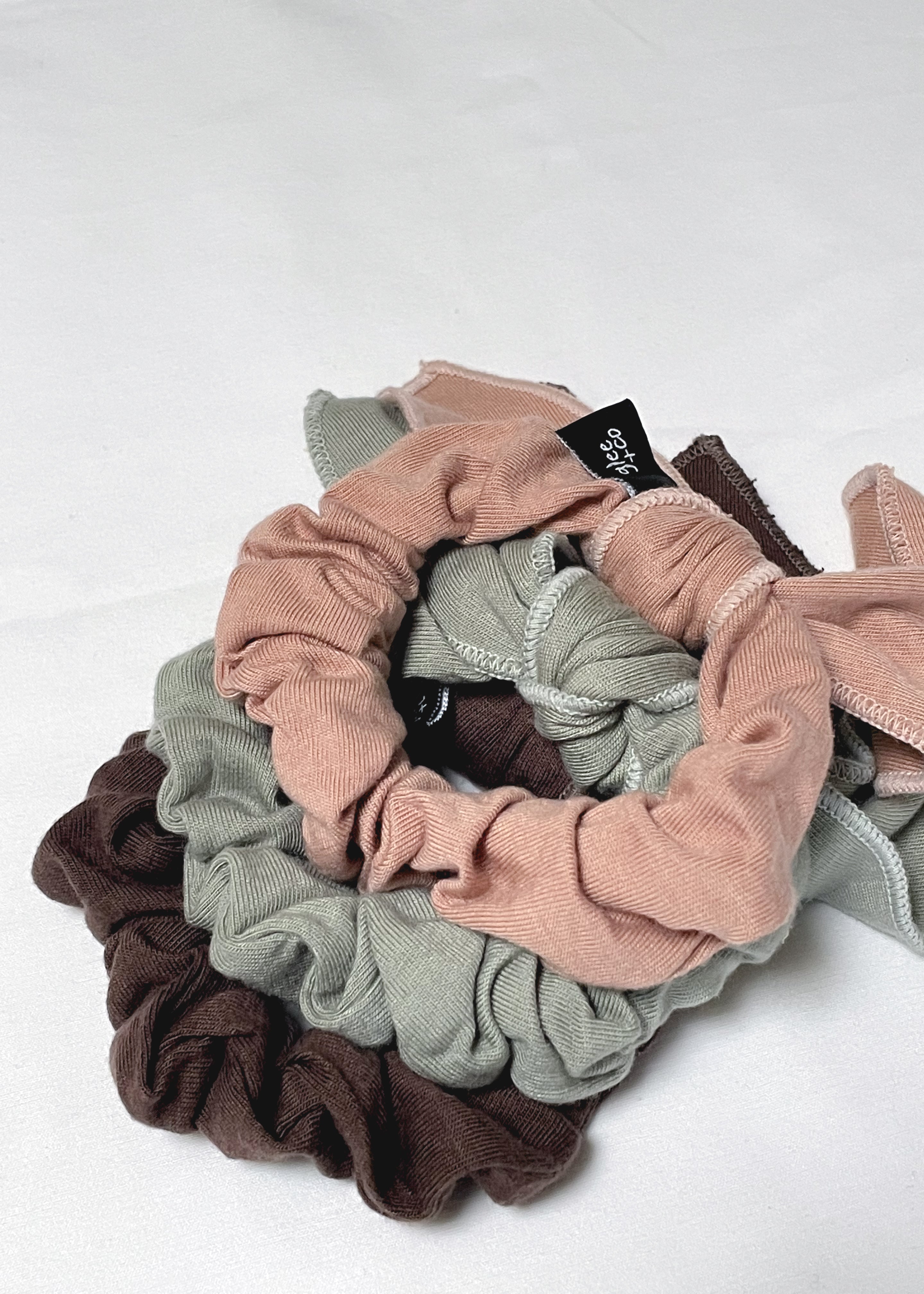 Cuter than your average black elastic tie. A pack of 3 scrunchies made from tencel/organic cotton blend fabric scraps and leftover elastic too short for clothes. It's as sustainable as it gets. When we say nothing goes to waste here, we mean it.
