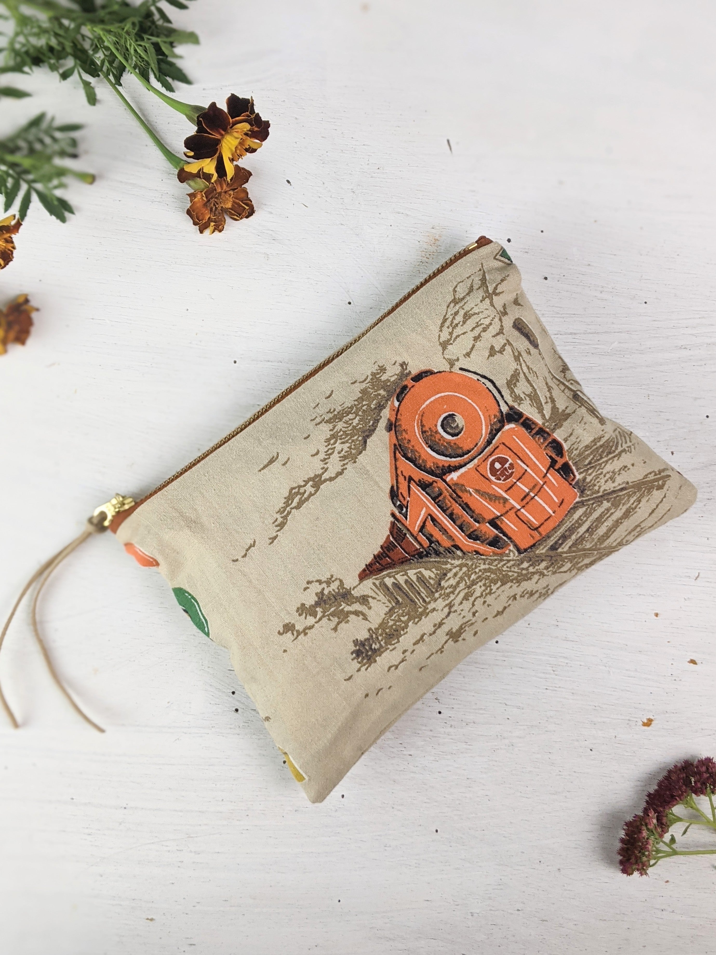 This rare vintage fabric shows classic American train motifs. Inside it is lined with a color coordinated deadstock cotton print.