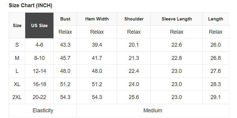 See size chart for approximate measurements.