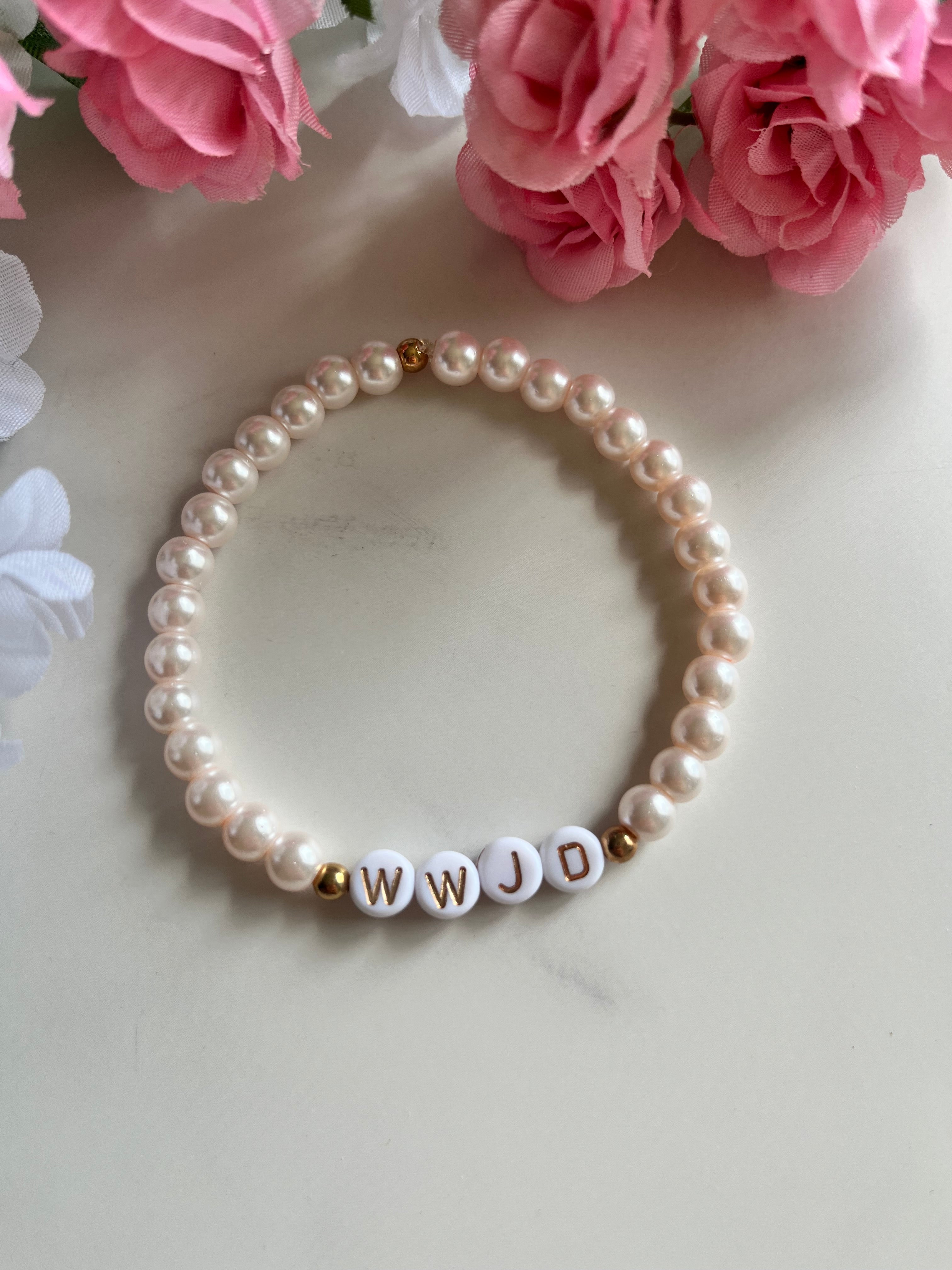 Express your faith with our WWJD Multi-Color, Blue floral, or glass pearl pink Bead Bracelet. Crafted with natural stones, this bracelet carries the message 'What Would Jesus Do,' a reminder to live with compassion and faith daily. Lightweight and durable, it’s perfect for any outfit and makes a meaningful gift. Wear it as a symbol of your journey and keep faith close every day. Order yours today!