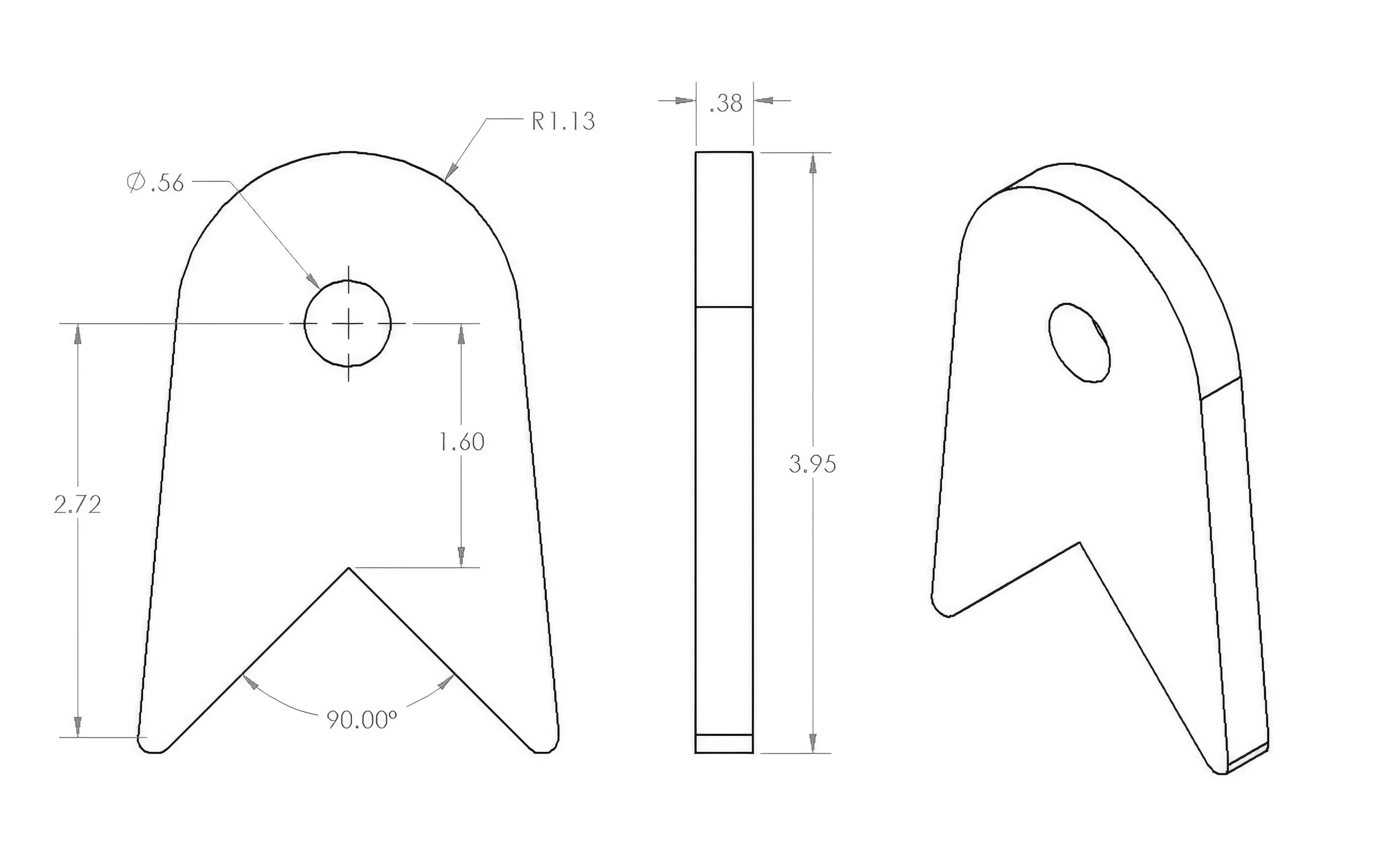 This medium 90-degree link tab is built for mounting to the edge of a frame, truss, or square crossmember. Crafted from 3/8" A36 steel and precision laser cut, it provides the strength and accuracy you need for suspension and link setups. It measures 1.75" from the base center to the bolt centerline and features a 9/16" bolt hole that can be easily drilled to a different size if required.