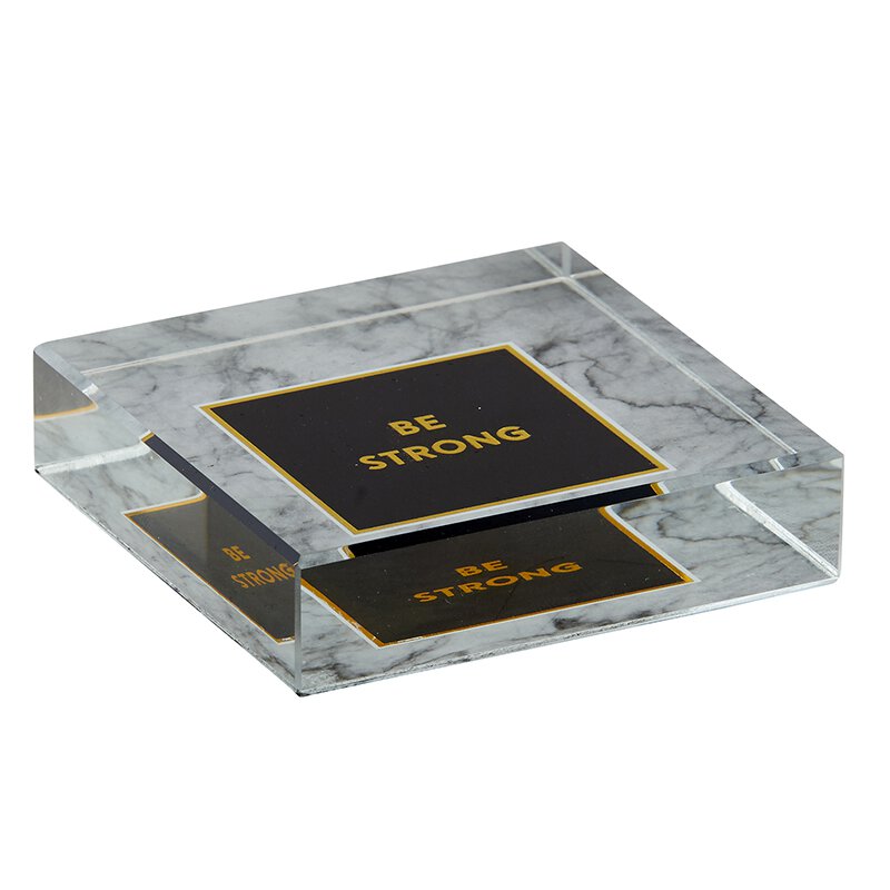 Square glass paperweight featuring 'Be Strong' in metallic gold text.