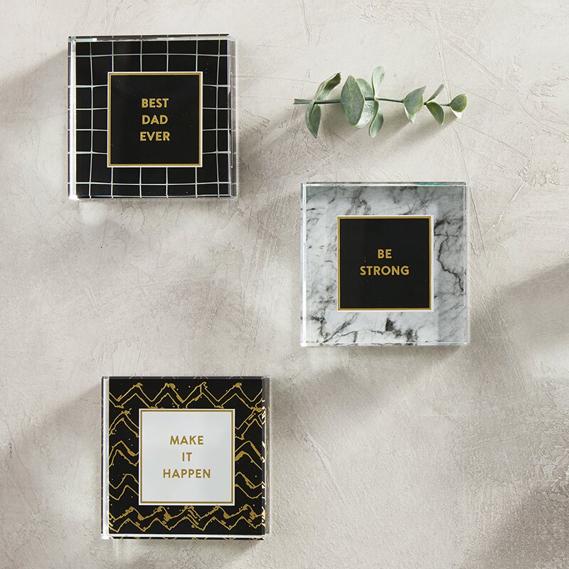This 3"x3" marble paperweight features 'Be Strong' in metallic gold text, making it a stylish addition to any desk or workspace. The soft felt bottom prevents scratching and comes packaged in a gift box for easy gifting. Made of durable glass, this paperweight by Heartfelt is both functional and decorative.