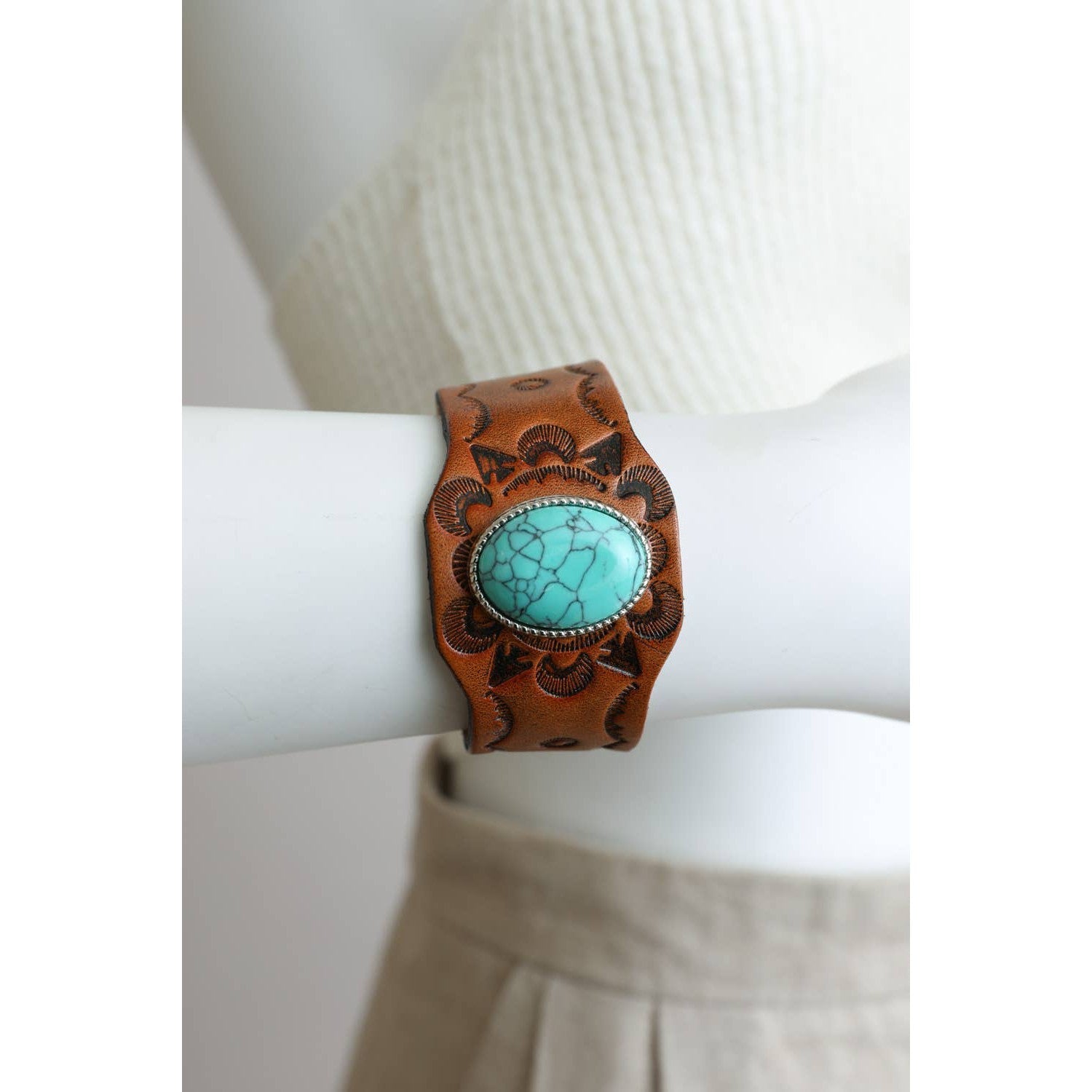 Embrace your bohemian spirit with this camel leather cuff bracelet, adorned with a captivating turquoise stone.