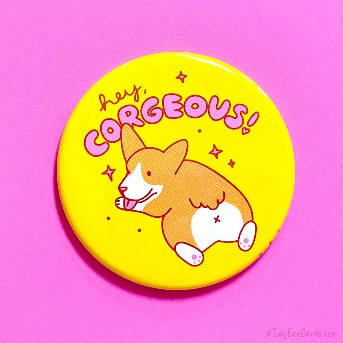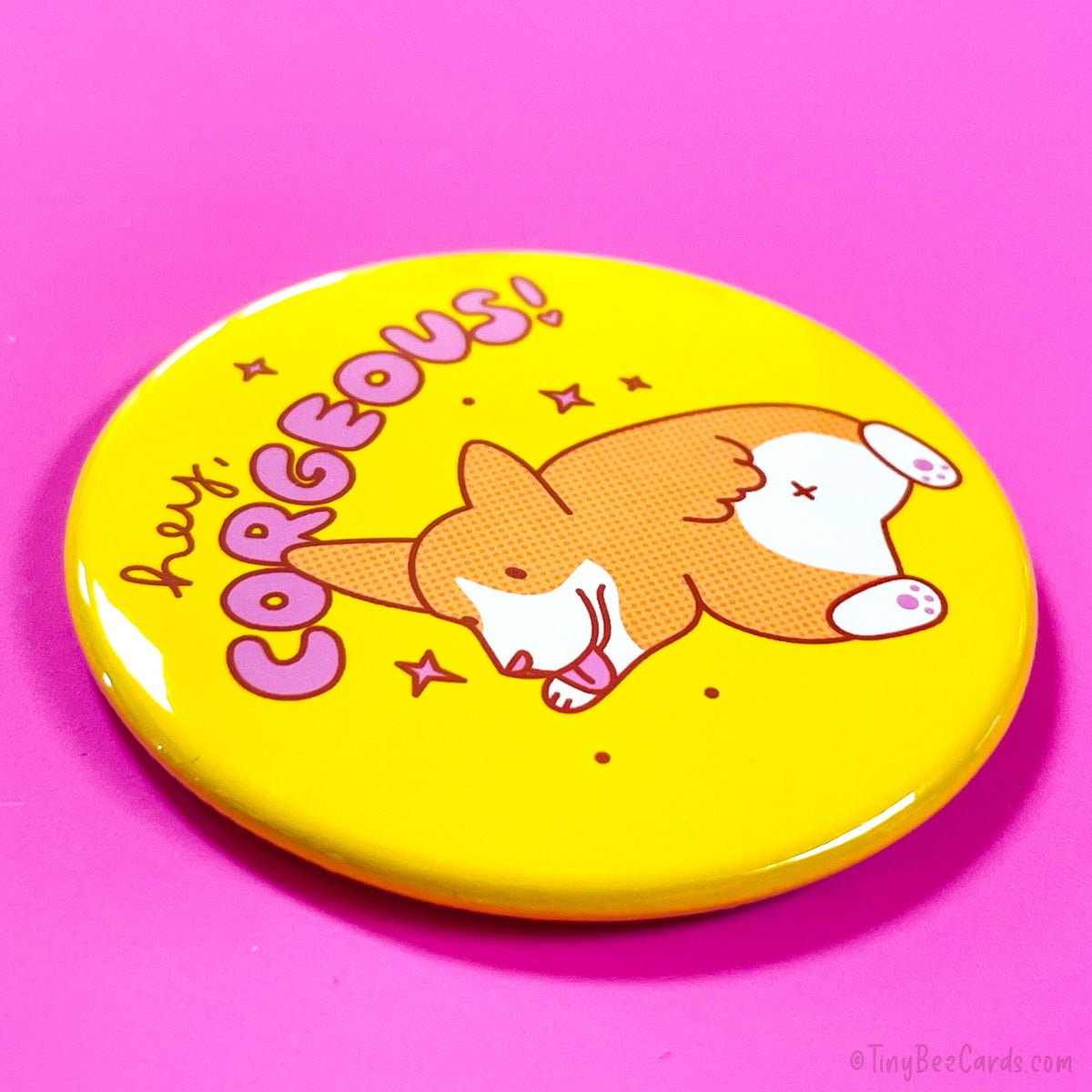 Corgi Dog Fridge Magnet or Pinback Button "Hey Corgeous!"