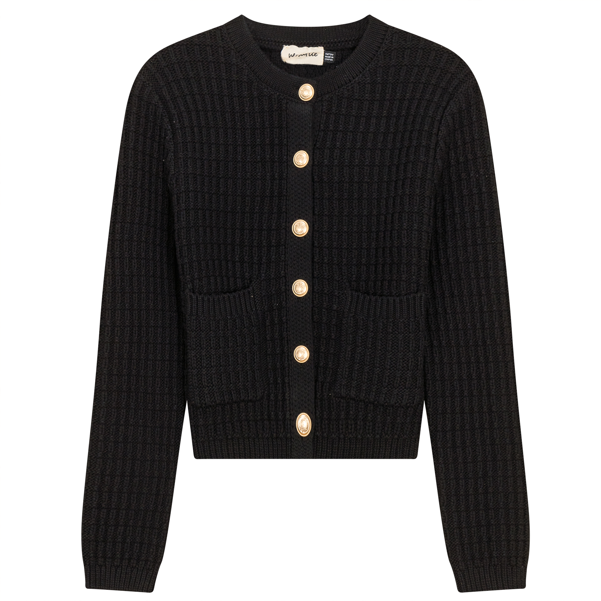Ladies long sleeve crochet knit short cardigan with center gold shank front button opening and patch pockets at front. ֲ