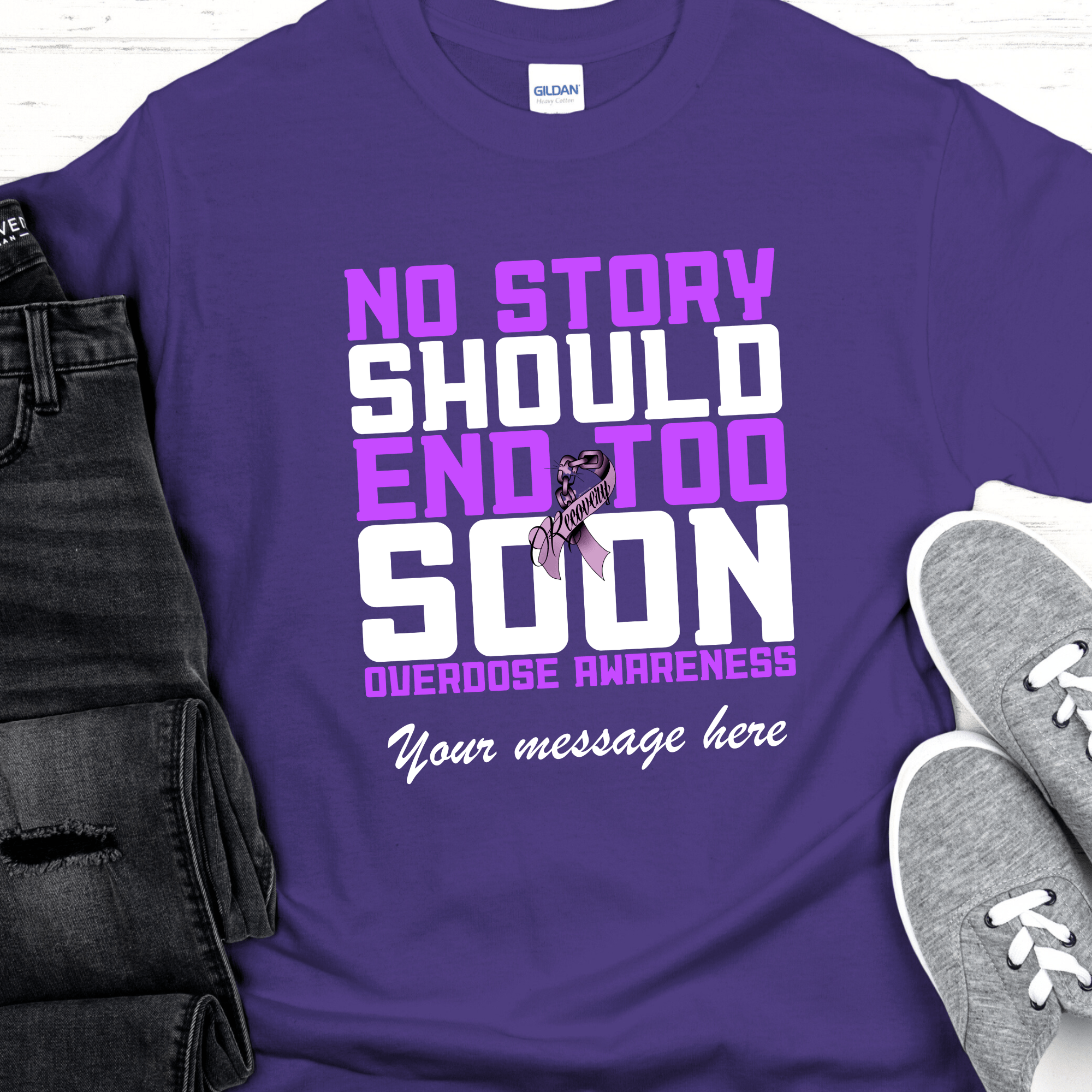 Custom Recovery T-Shirt | Inspiring Sobriety | No Story Should End Too Soon - Overdose Awareness