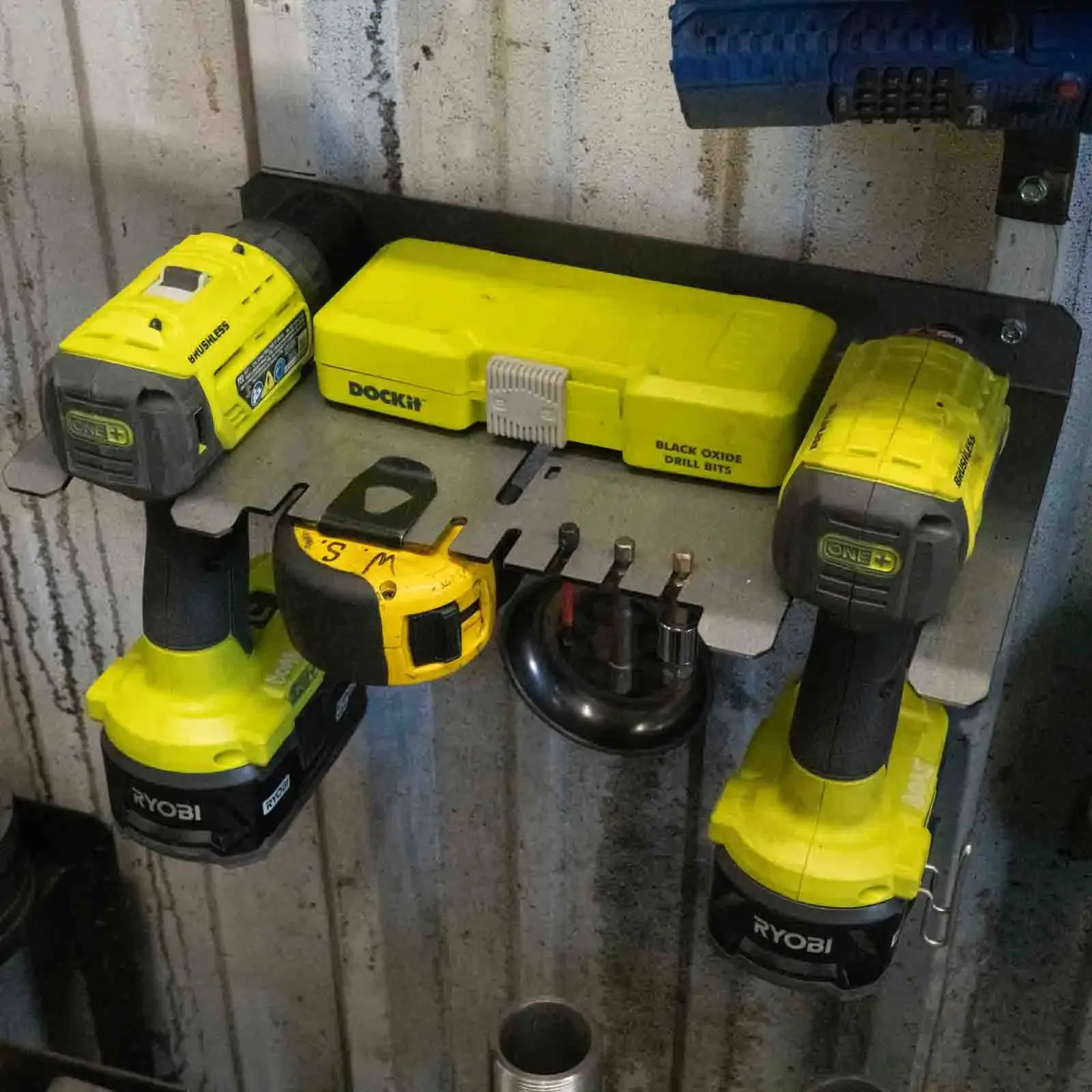 This holder is built from .104" steel and designed to store two cordless drills or impact drivers along with a charger. It keeps your most-used tools organized and easy to access in one spot. The cutouts are sized to fit most standard cordless drill handles.
