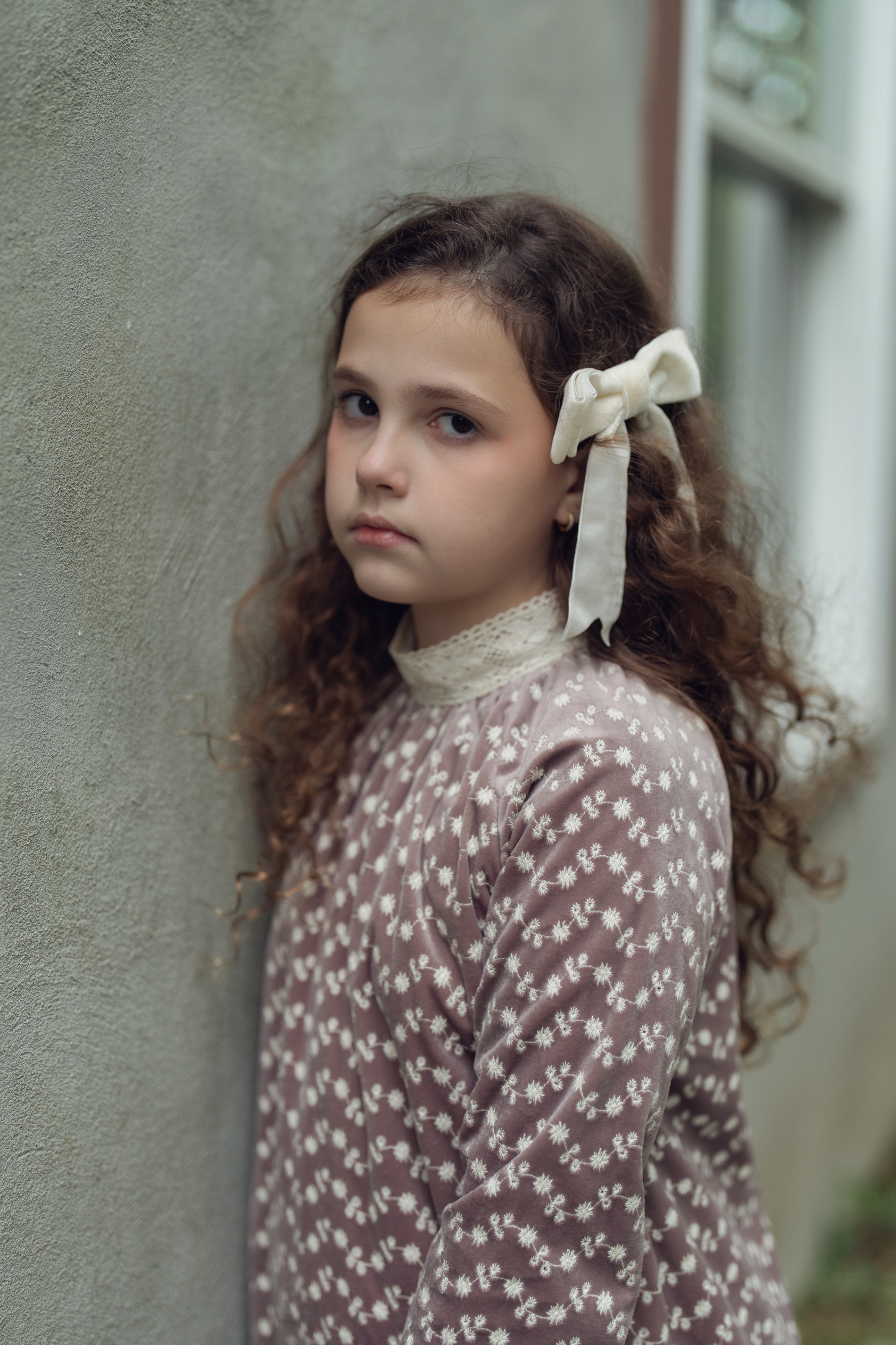 Girls velvet embroidered dress with lace around neck and cuffs with center back zipperֲ
