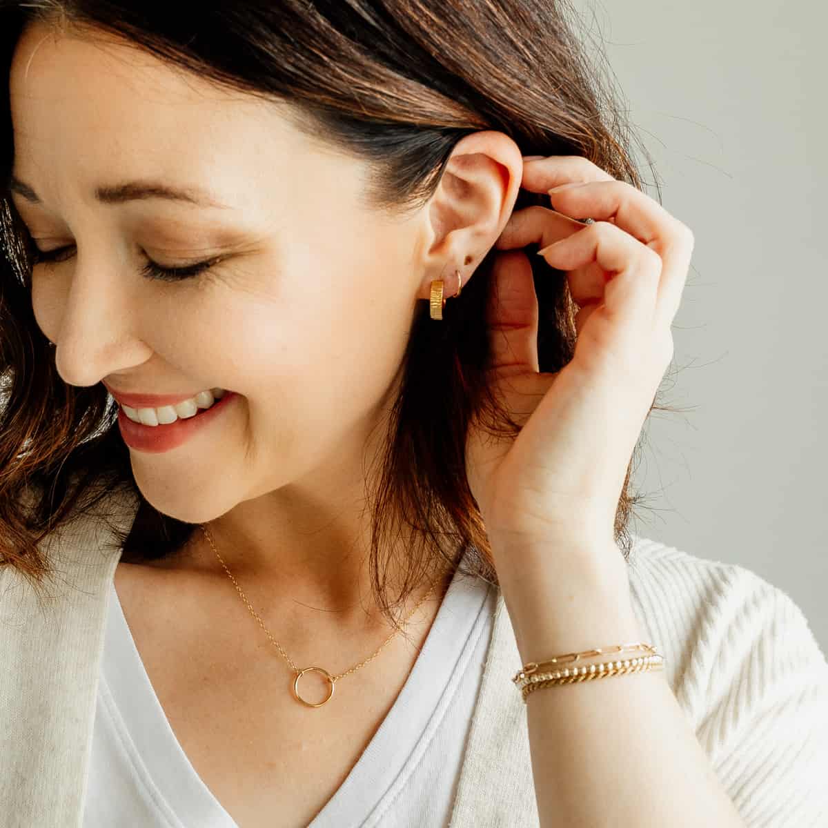 Our Essie Circle Necklace is a piece of timeless jewelry you will reach for over and over again. Featuring an effortlessly light and beautiful 14k gold filled open circle, this minimal design is perfect for everyday wear. Layer it with other necklaces or wear it alone.