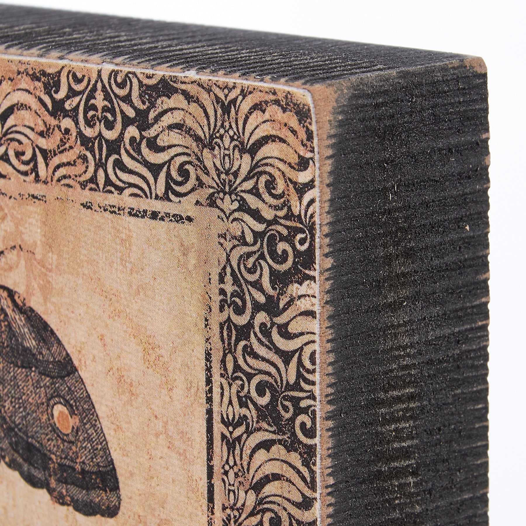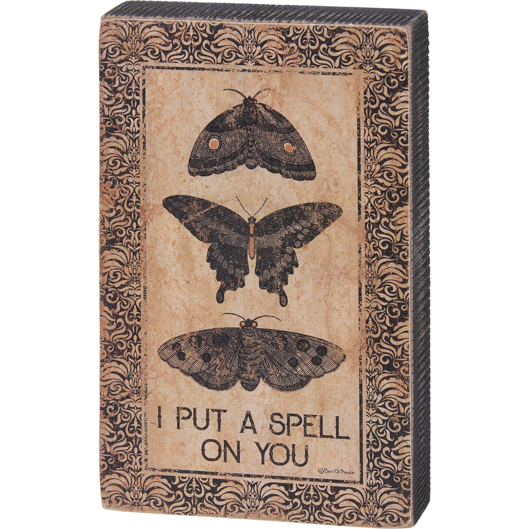 A wooden block sign displaying rustic design of moths with "I Put A Spell On You" sentiment. Sides feature distressed, rough wood painted black for added texture.