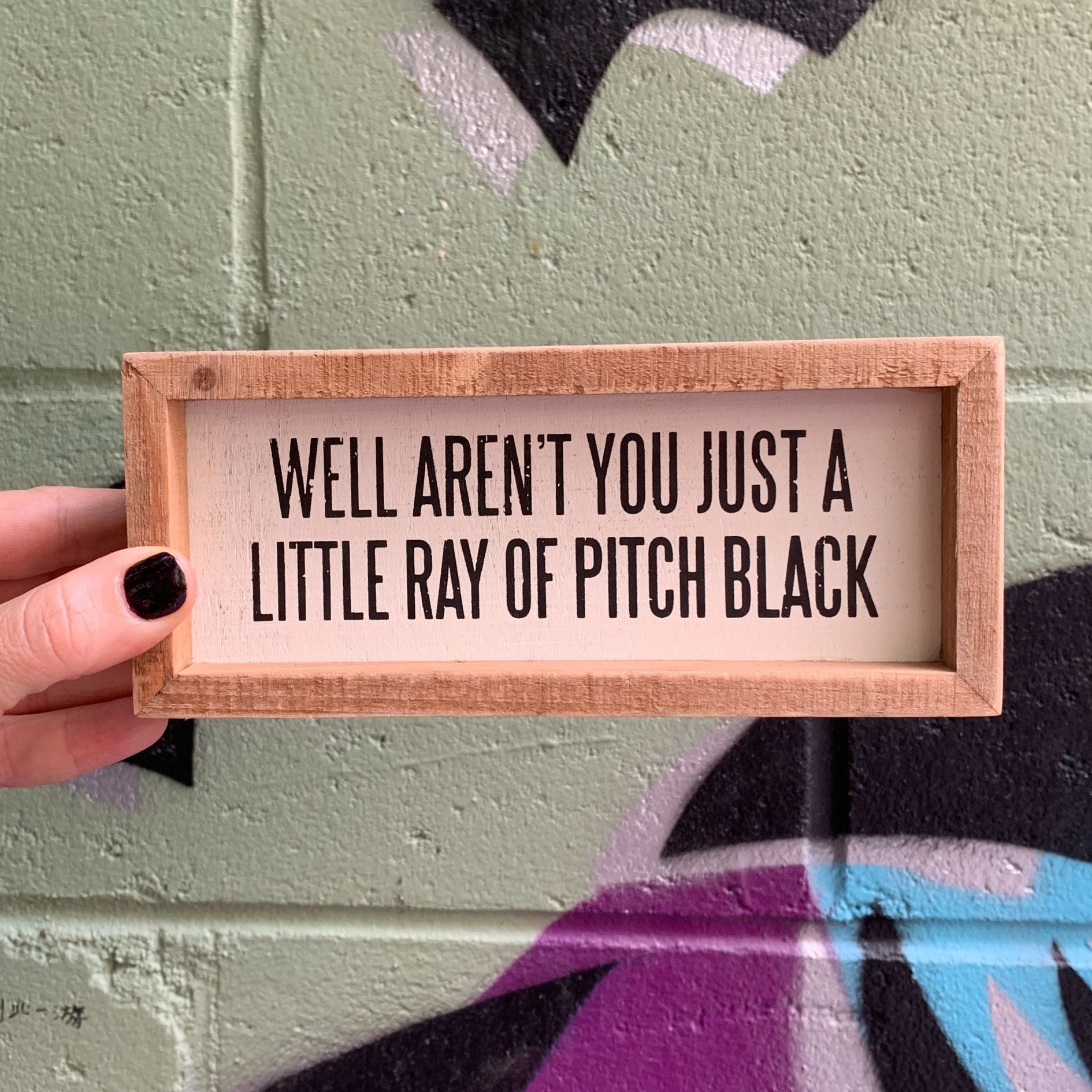 An inset wooden box sign featuring "Well Aren't You Just A Little Ray Of Pitch Black" sentiment. With a rustic charm and boho vibes, this sign is the perfect way to add a little ray of pitch black attitude to your decor.