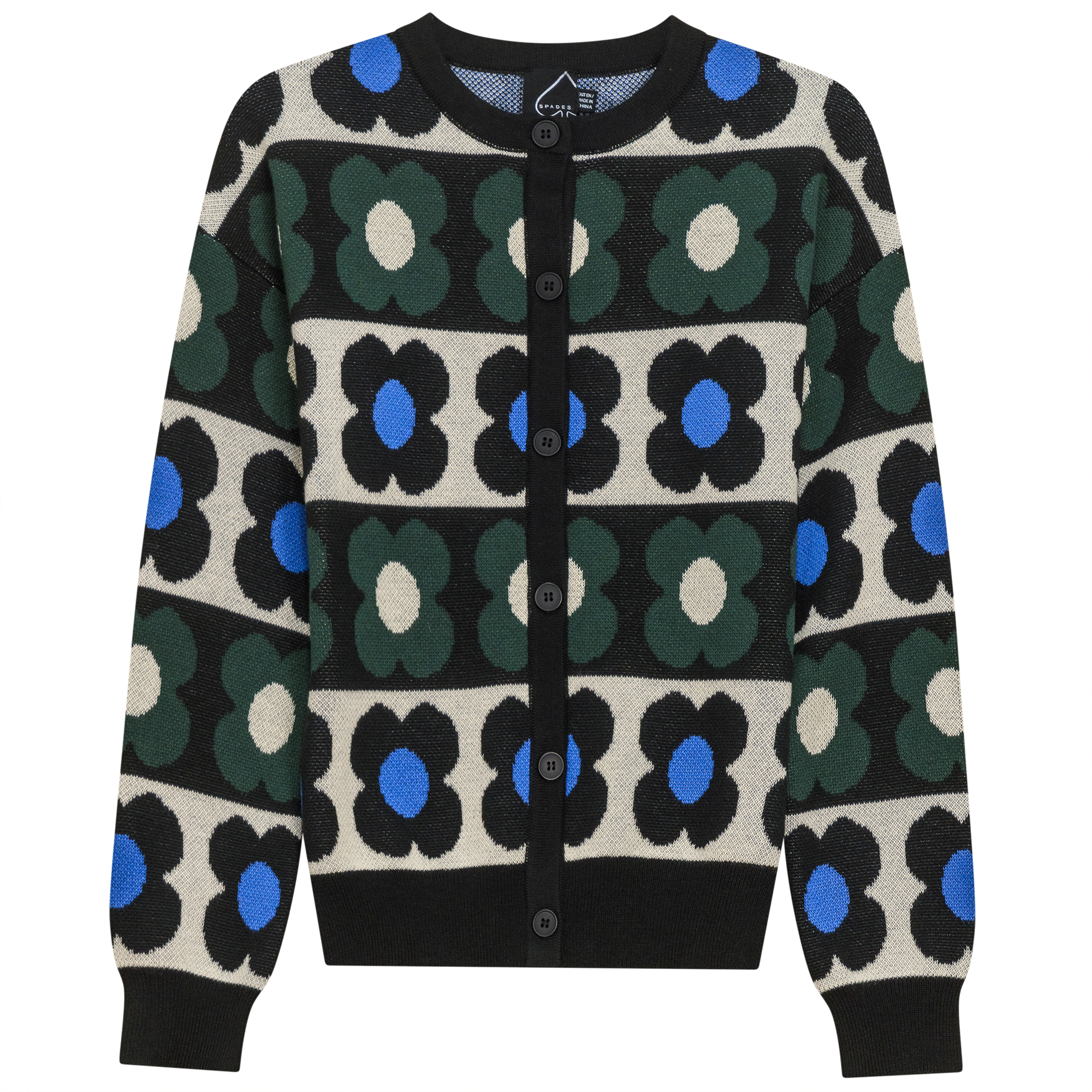 Ladies long sleeve floral knit cardigan with center front button opening and ribbed hemband and cuffs. ֲ