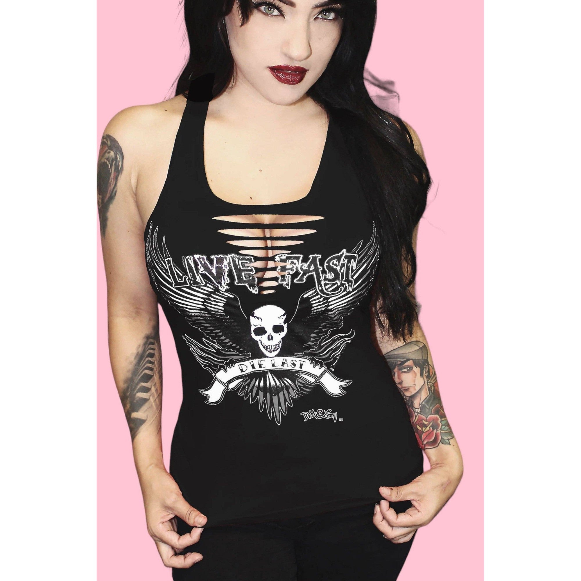 Sexy racerback tank top with skull wings tattoo graphic. "Live Fast Die Last" Original Graphics with slashed neckline.