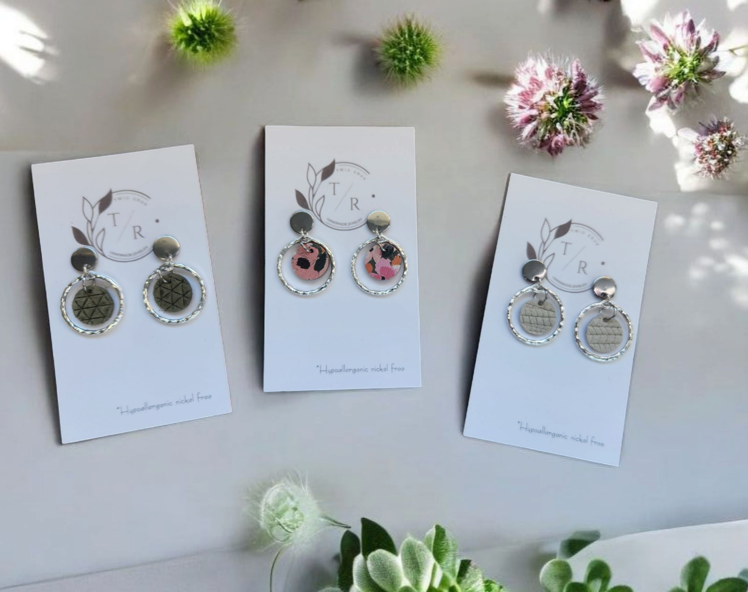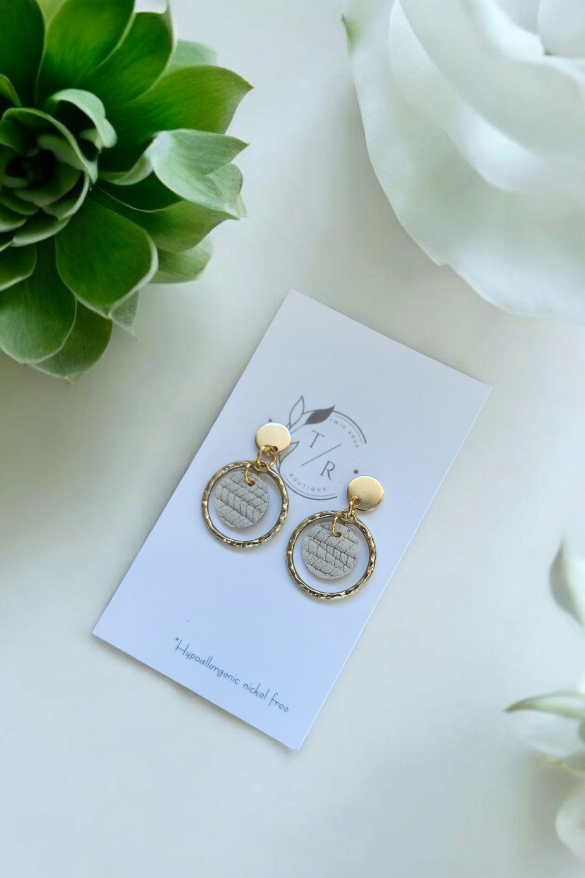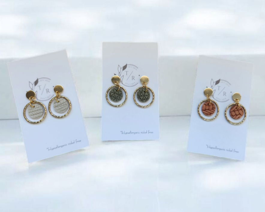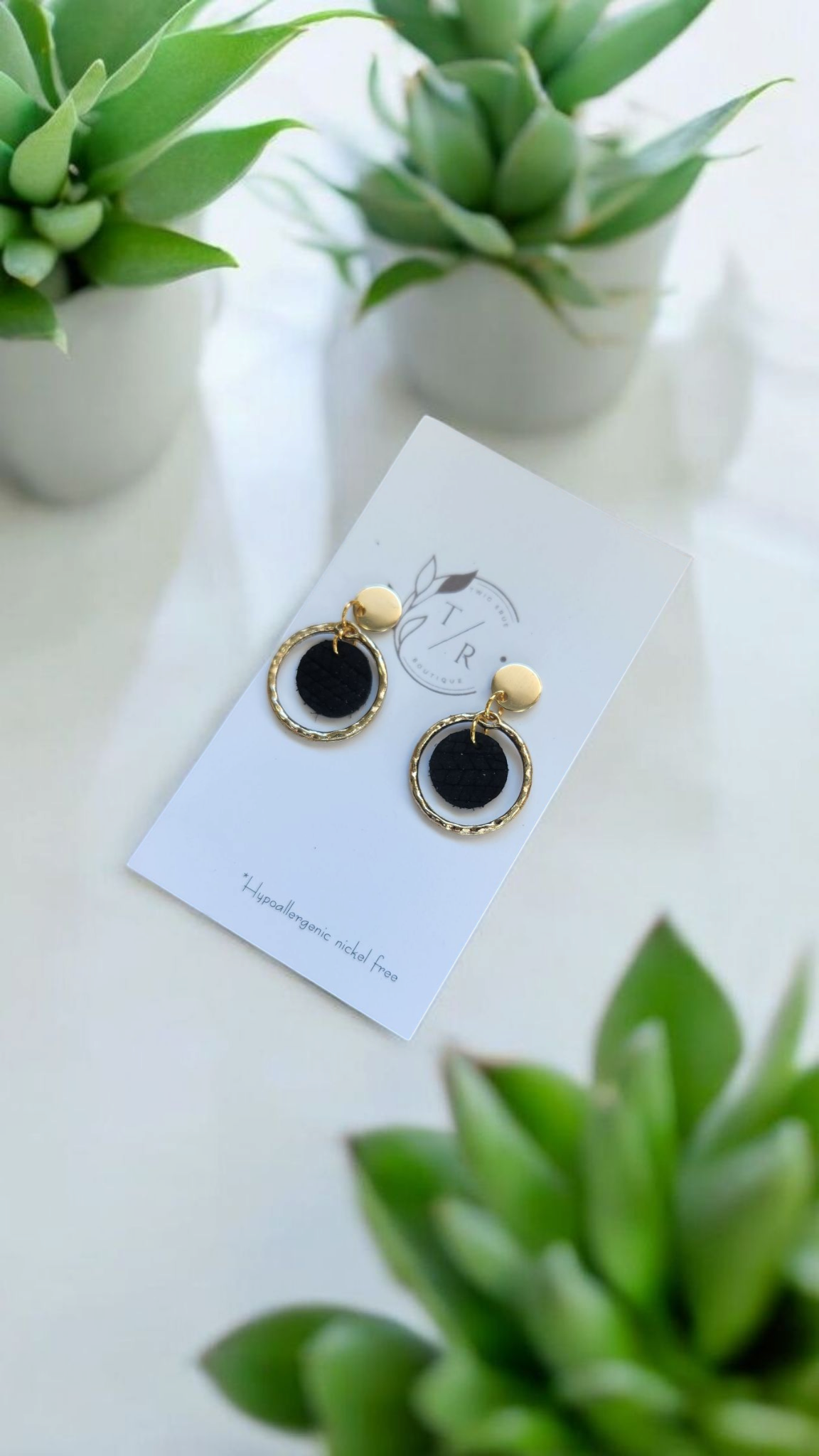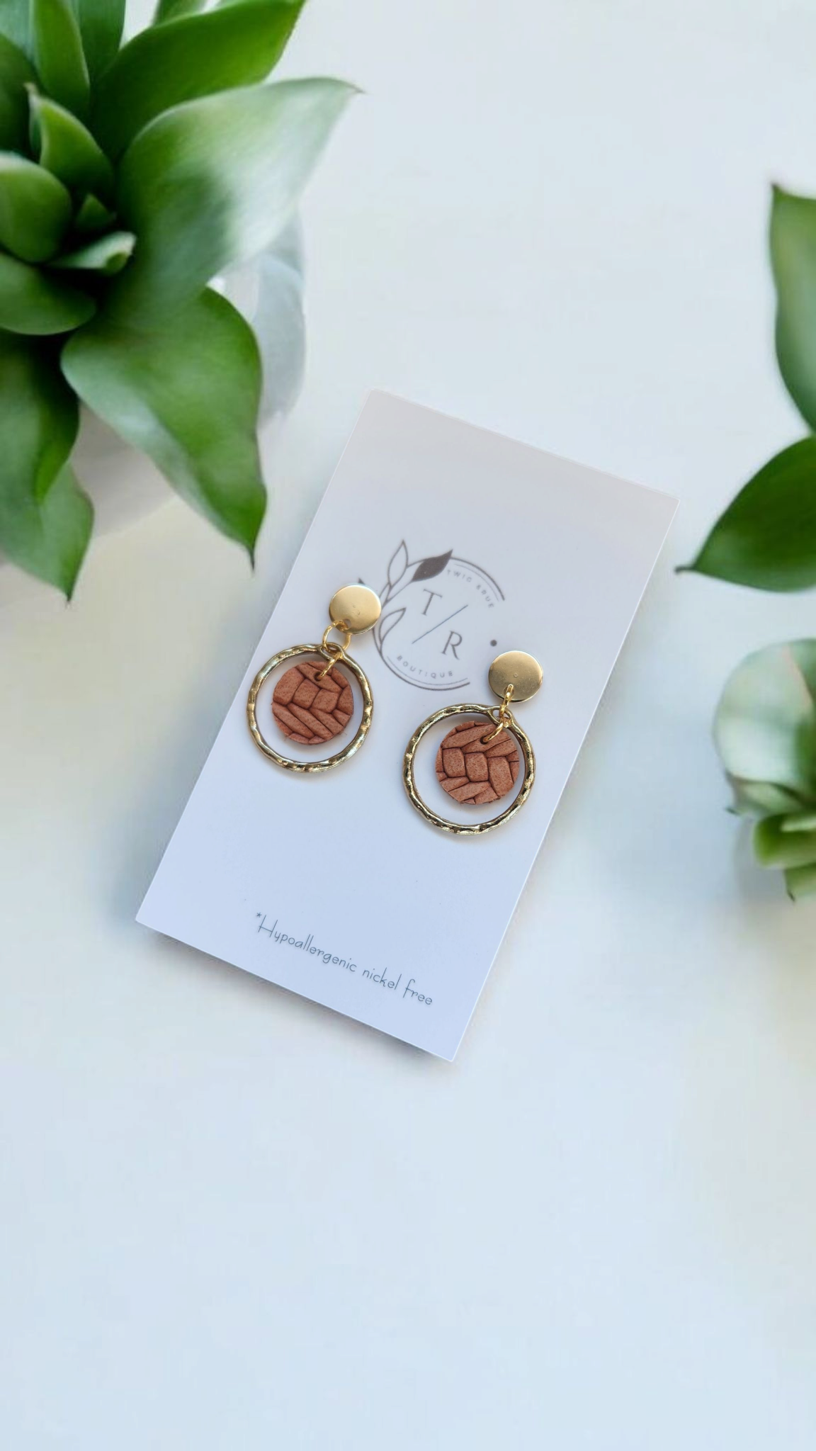 A mini version of our popular Carli- a fun & flirty statement earring! We use a 16k gold or silver plated hammered circle with genuine cork leather or embossed genuine leather. Hypoallergenic, nickel free and lightweight!