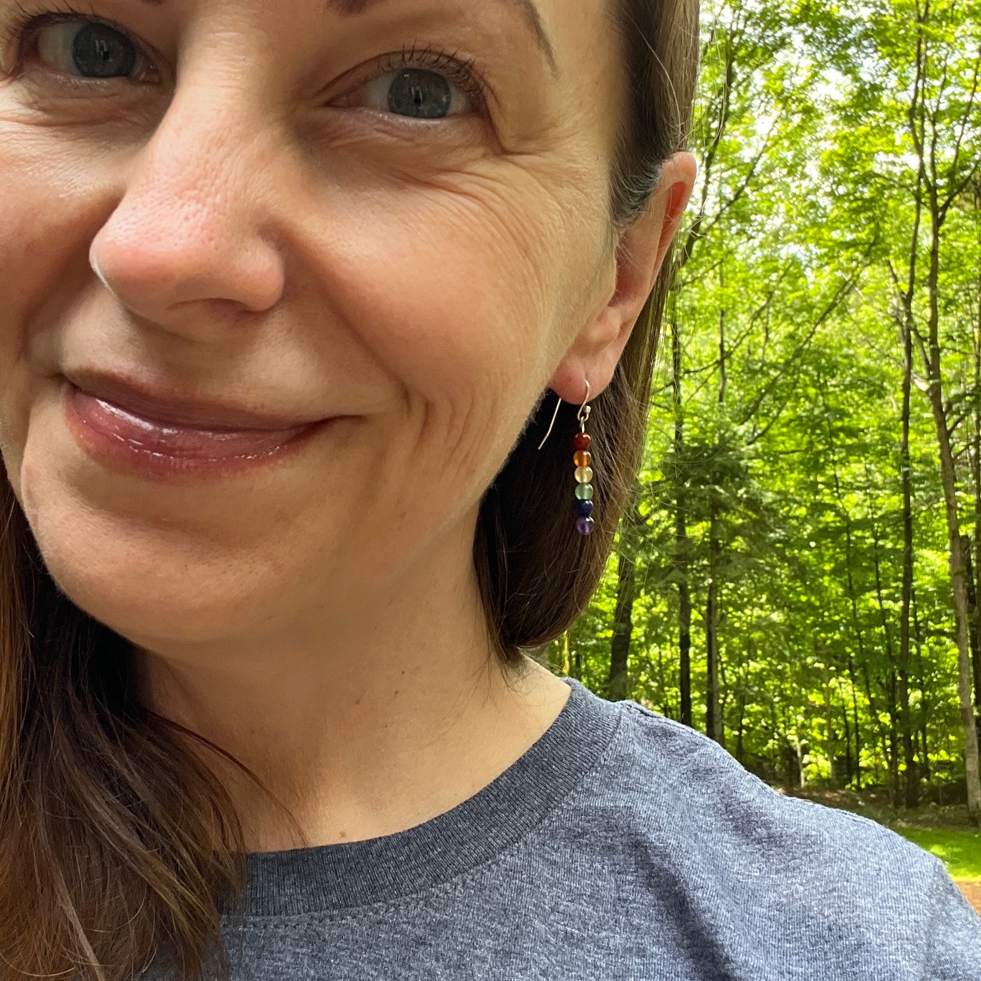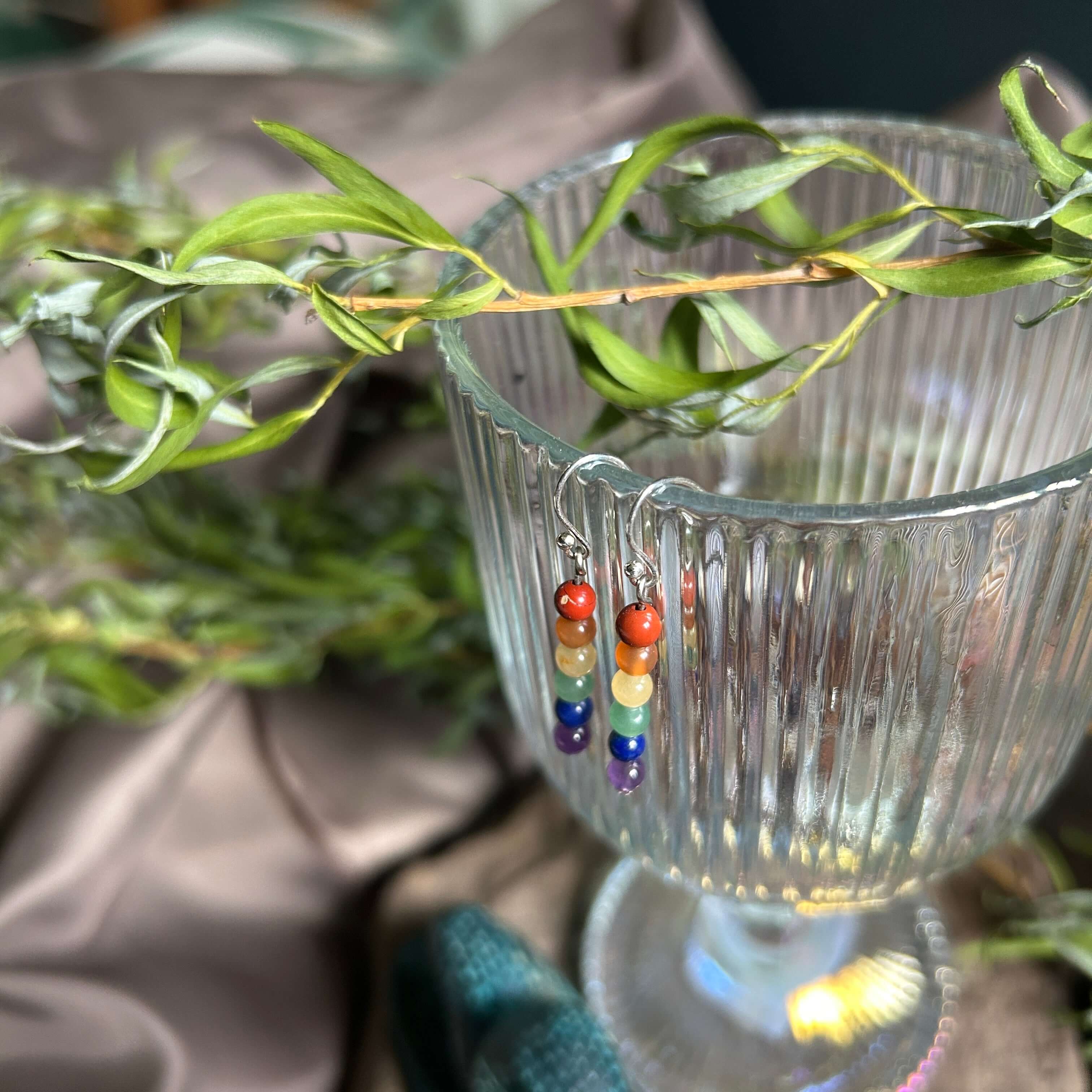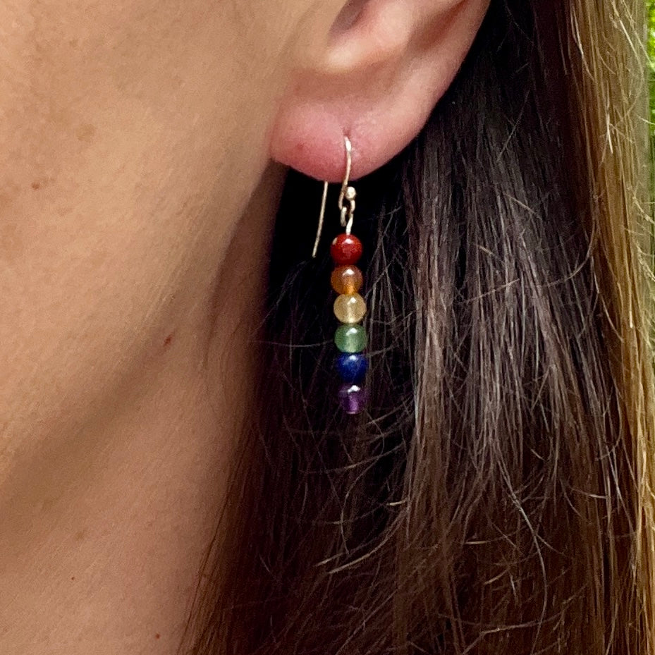 Each earring features six 4mm natural gemstones that align with the chakra colors, creating a gradient from warm earth tones to cool blues and purples.