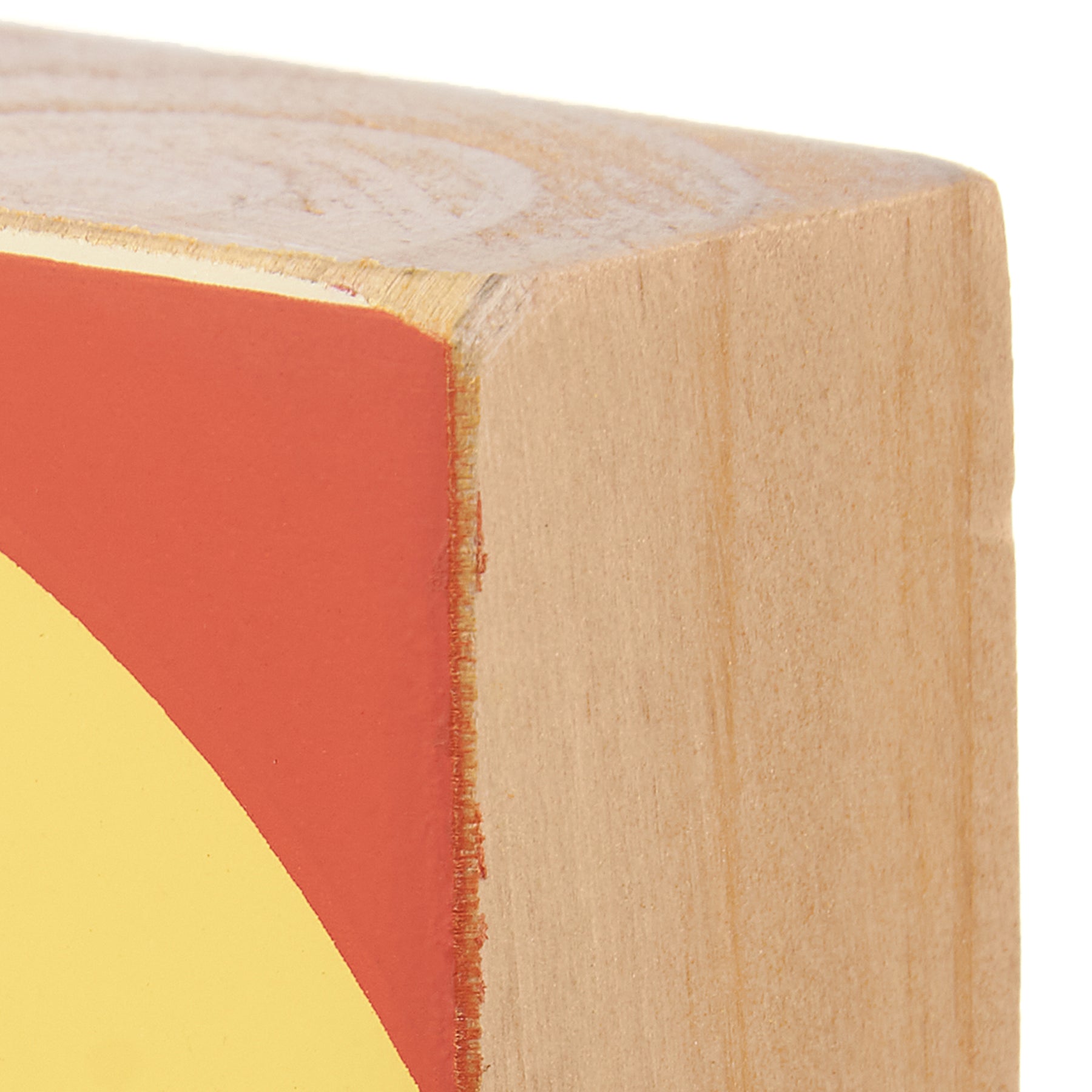A groovy wooden block sign displaying a "Show Yourself More Love" sentiment with retro swirl designs forming a heart. Sides feature smooth wood for added interest. The Show Yourself More Love block sign is easy to hang via predrilled keyhole slot or can free-stand alone.