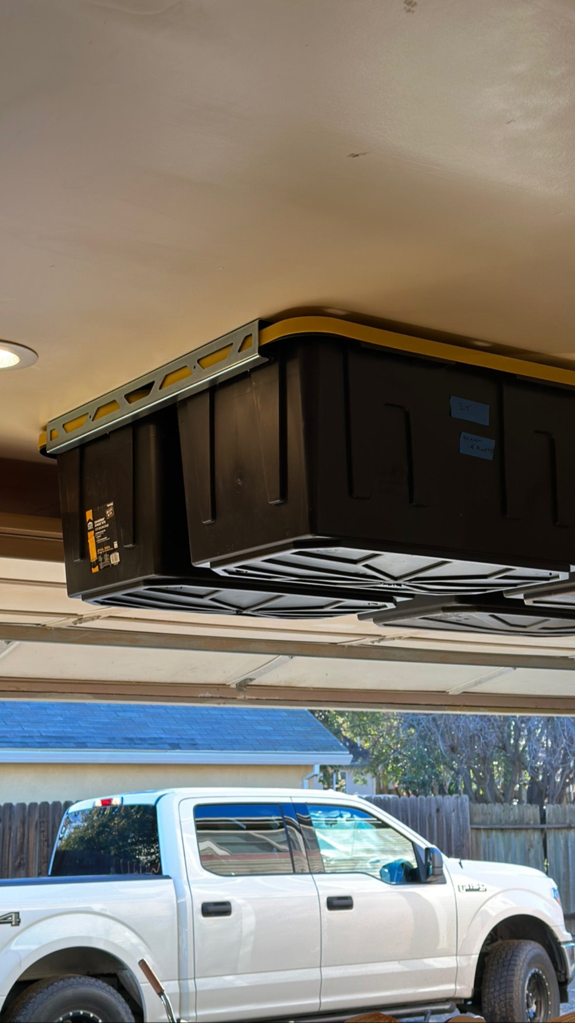 Ceiling-mounted storage rails for 27-gallon HDX storage bins.