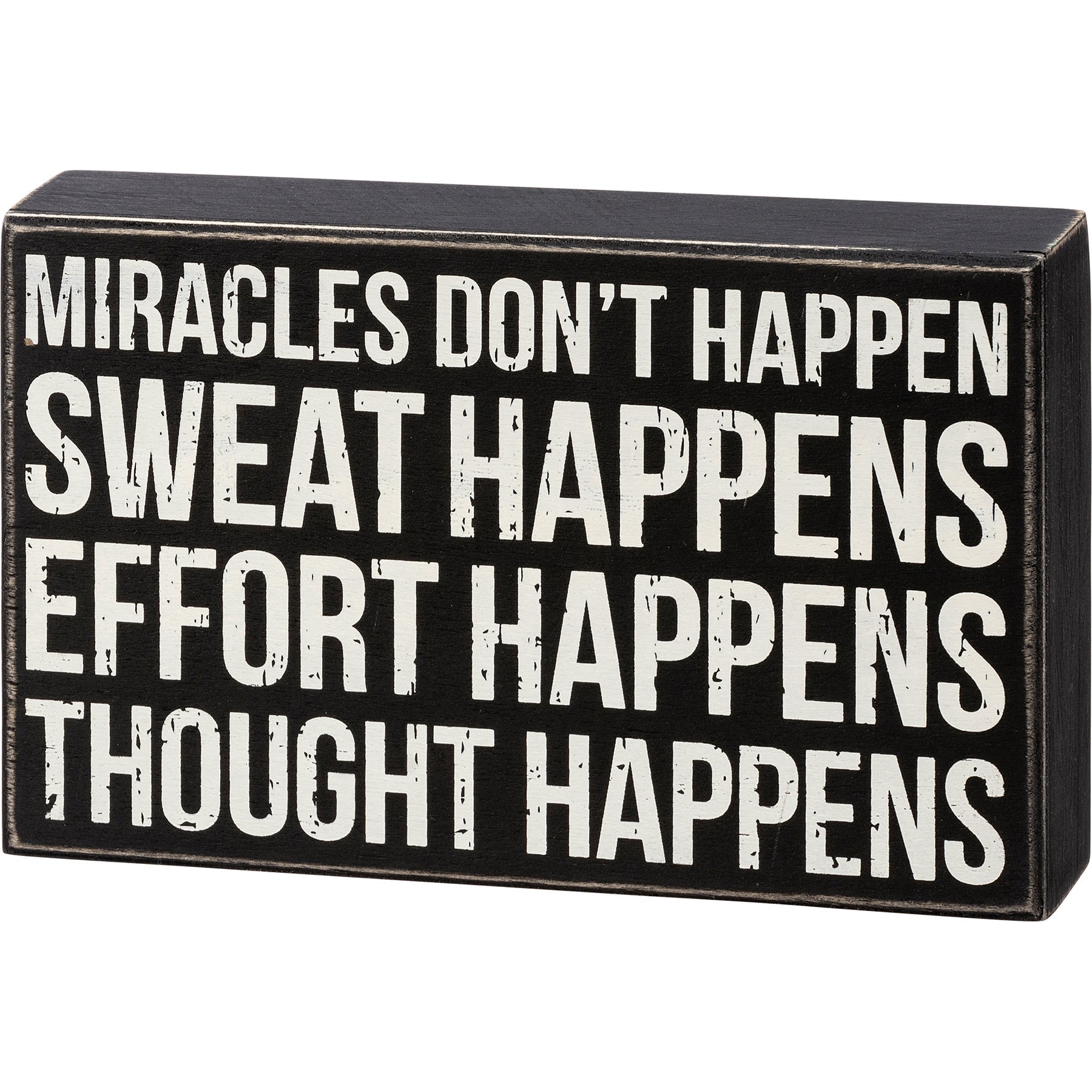 A classic black and white box sign features a distressed "Miracles Don't Happen Sweat Happens Effort Happens Thought Happens" sentiment.