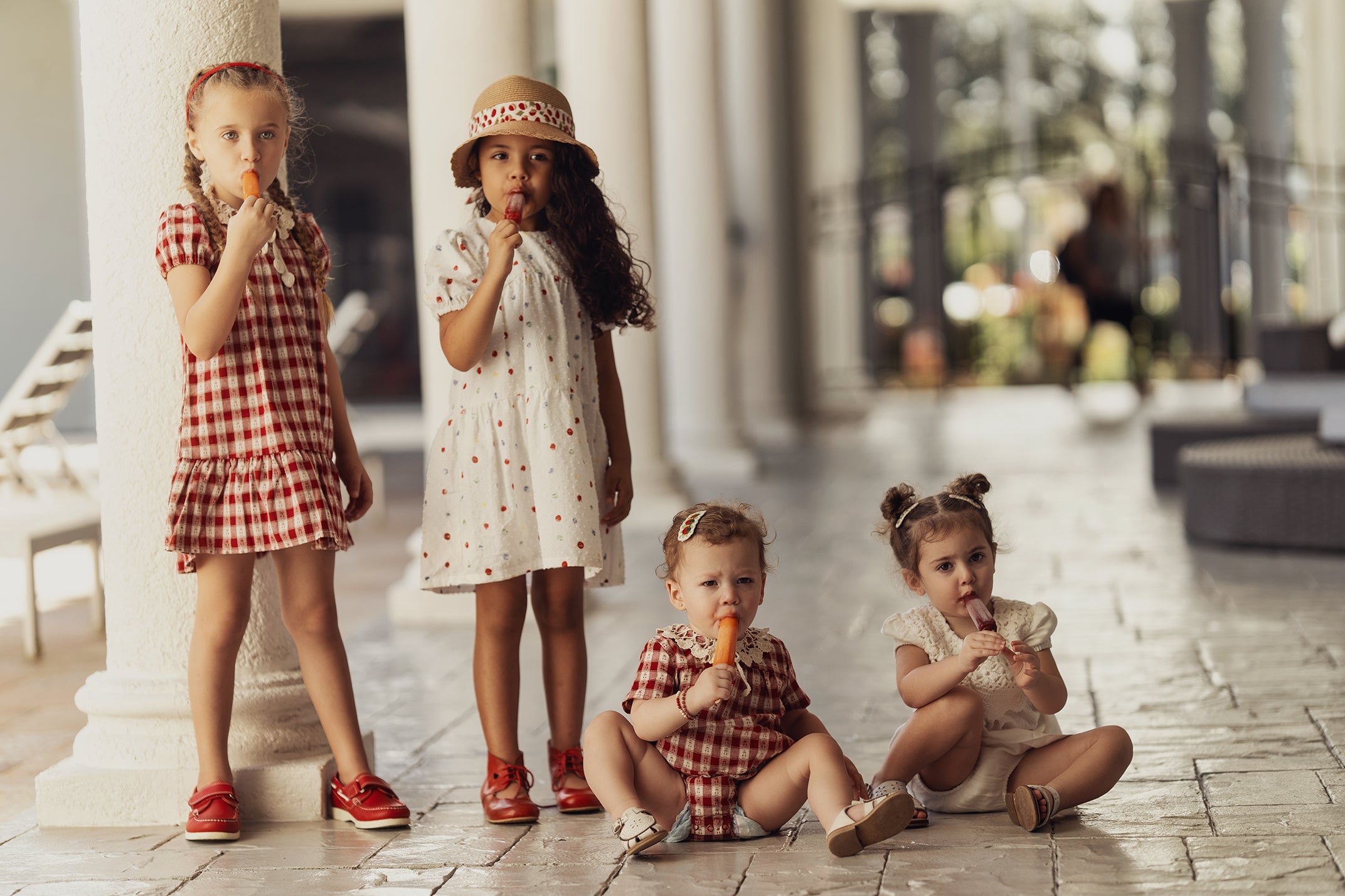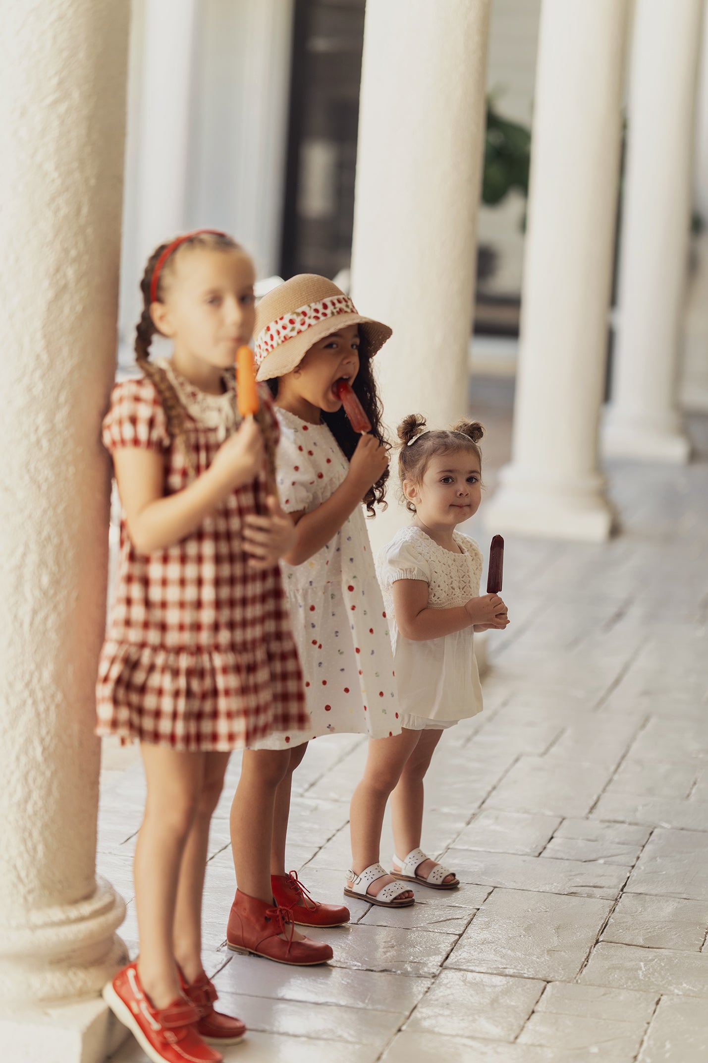 Girls tiered doted dress with elastic cuffs and center back invisible zipper. ֲ
