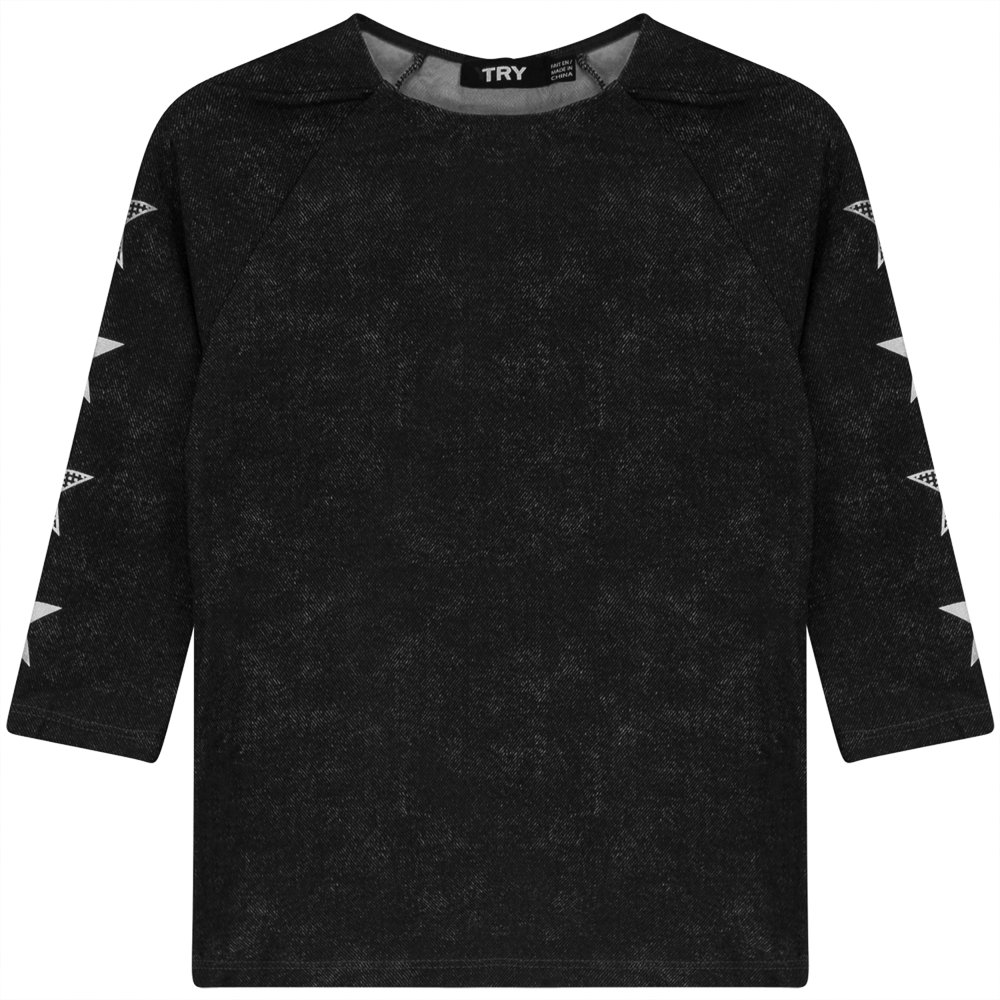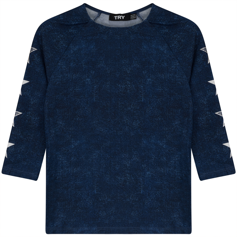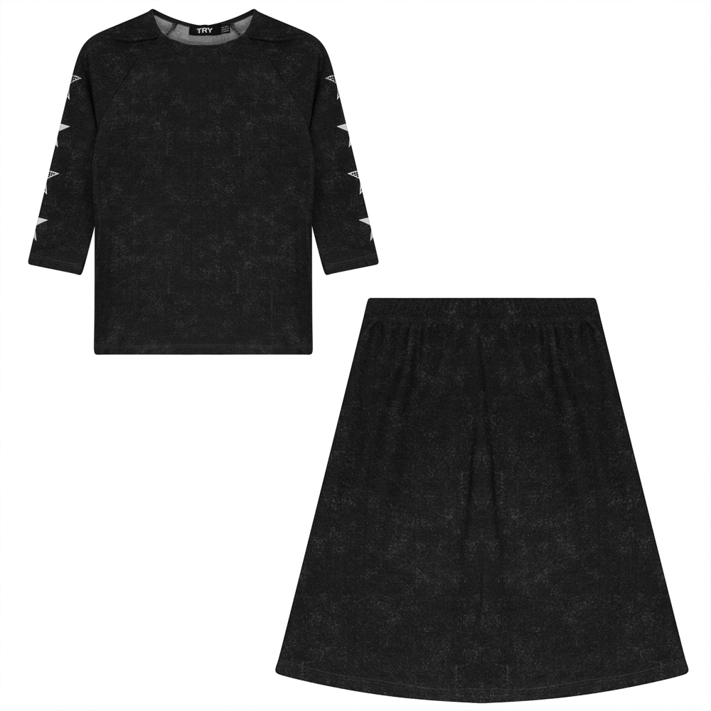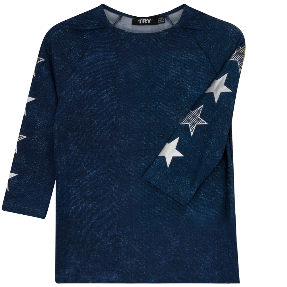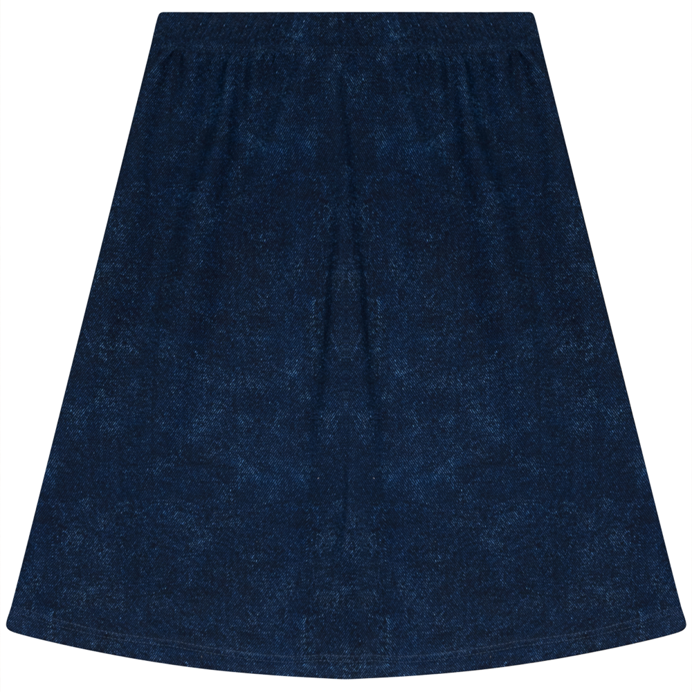 Girls 2pc denim wash swim set with graphic stars printed on side sleeves and matching skirt with elastic waistbandֲ