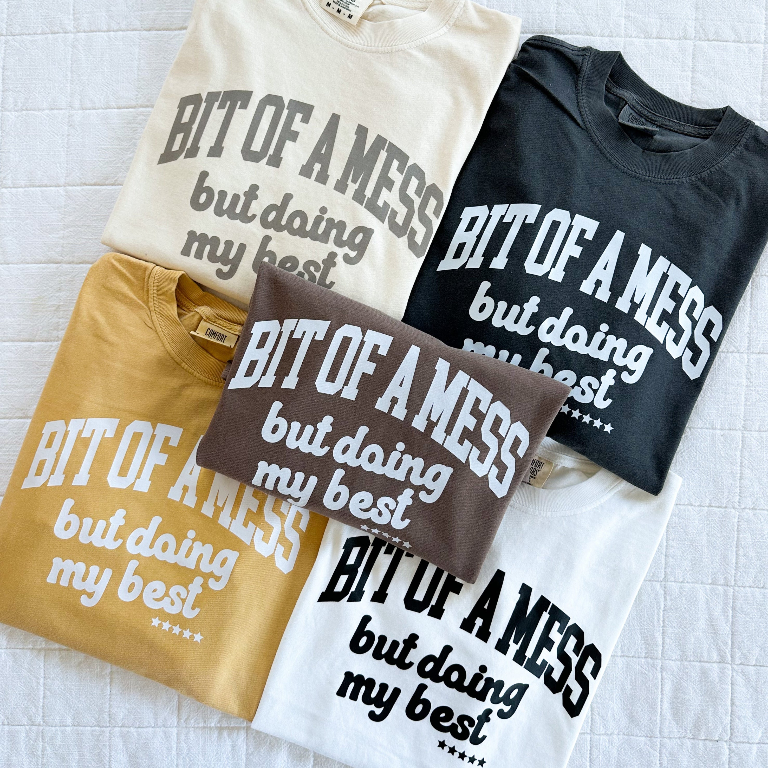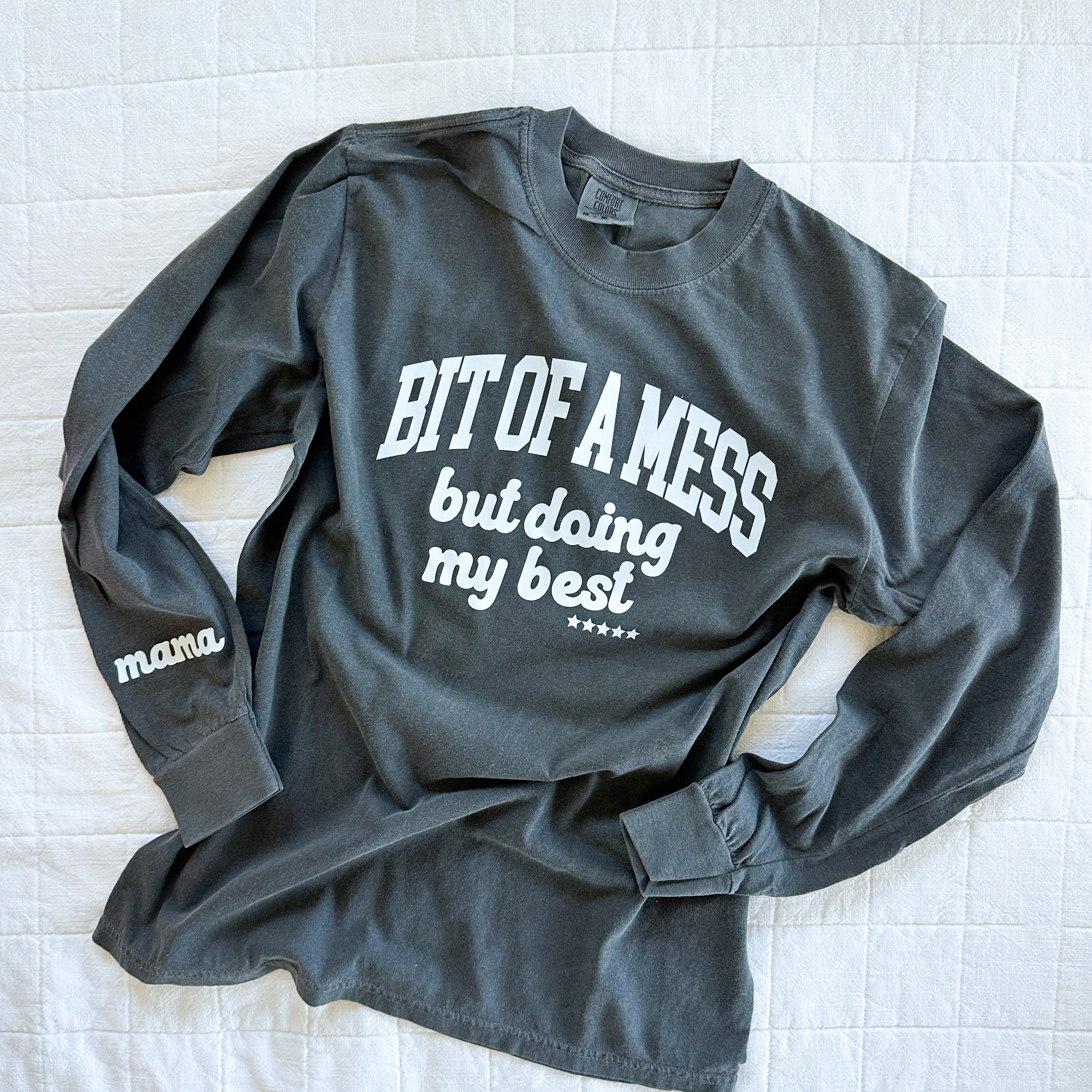 Bit Of a Mess (But Doing My Best / Mama on Sleeve) - Neutrals - LMSS® Exclusive - Long Sleeve Comfort Colors Tee