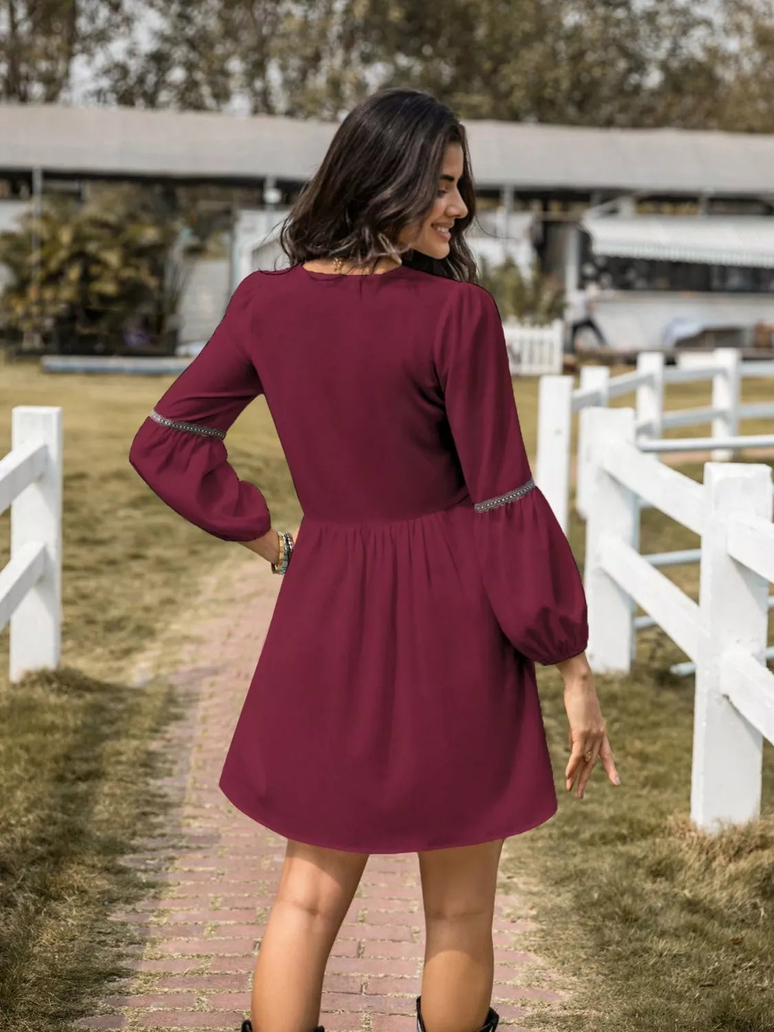 Long Sleeve Mini Dress with Contrast Trim ‐ Burgundy / M
