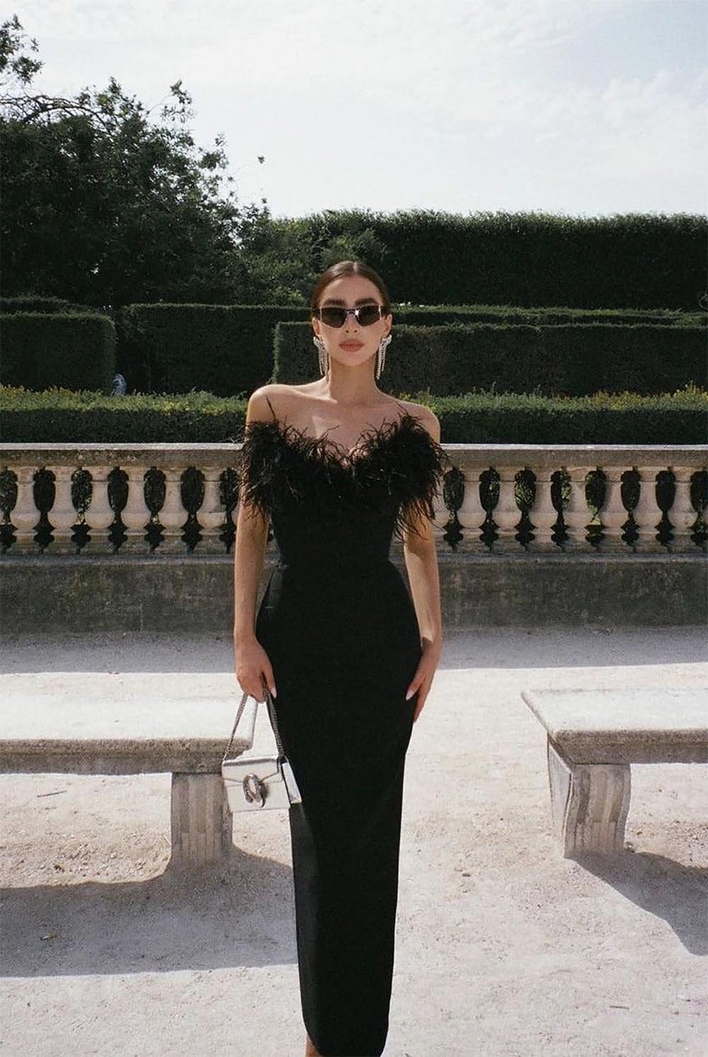Tailored Feather-Embellished Deep V Maxi Dress | ZAKAPOP ‐ Black / M