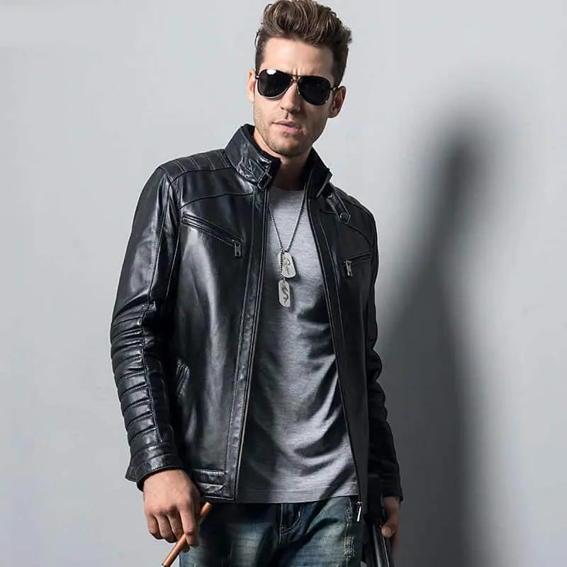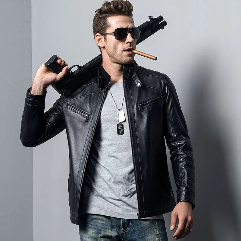 Men’s Genuine Sheepskin Biker Leather Jacket ‐ S / Male